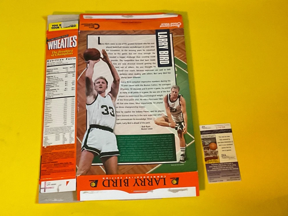 WHEATIES COMMEMORATIVE EDITION for LARRY BIRD. This box commemorates the career of Larry Bird as a player for the Boston Celtics and a coach of the Indiana Pacers. The autograph is in black sharpie ink with the inscription “Best Wishes” and authenticated by JSA (Ja,es Spence Authentication) # J14184. The box is in Excellent Condition with vivid colors. There are two creases along the middle of the top and bottom folds. Please contact me if you have any questions. There are no returns.