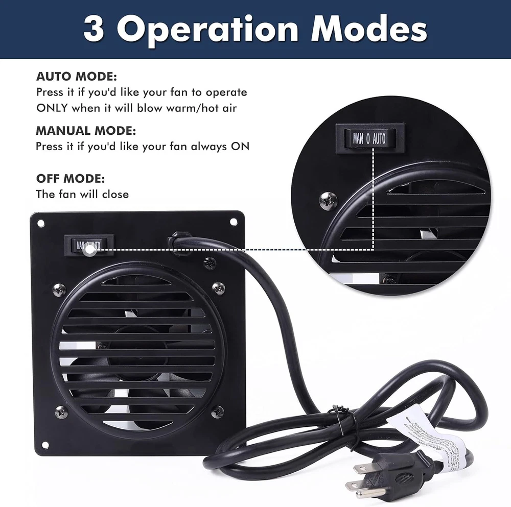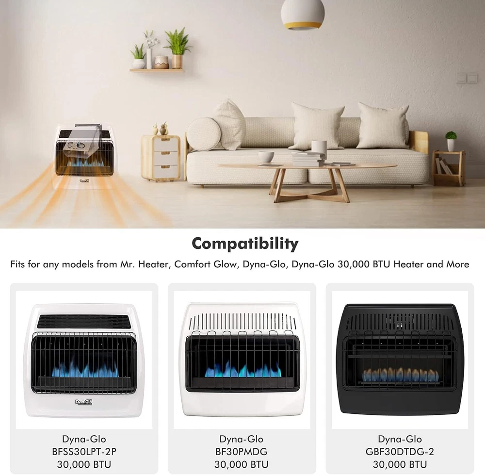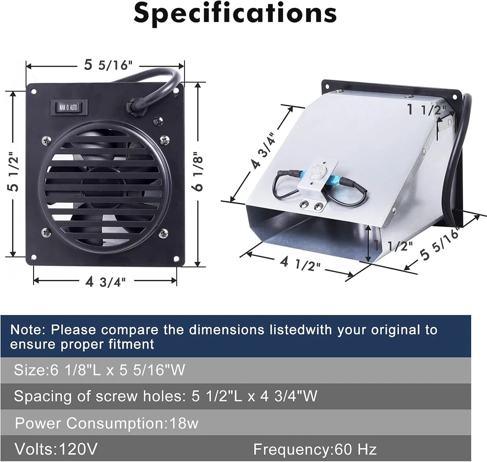 【What’s in the box】 The WHF100 Dyna-Glo heater fan is a replacement fan complete assembly, it comes with 4 feet long three prong plug, built-in thermostat, mounting screws. 【Applicable Models of The WHF100 Blower Fan】The Vent Free Wall Heater Fan is designed to fit a number of heaters, including many models from Mr. Heater, Comfort Glow, Dyna-Glo Heaters. See our compatibility chart in below description. Please be sure to compare our dimensions with your heater's available clearance and dimensions before ordering. 【Fits for】Replacement WHF100 Heater Fan for Dyna-Glo BF30PMDG 30,000 BTU, Dyna-Glo BF30NMDG-4 30,000 BTU, Dyna-Glo BFSS30LPT-2P 30,000 BTU, Dyna-Glo BF20NMDG 20,000 BTU, Dyna-Glo BFSS30NGT-4N 30,000 BTU, Dyna-Glo BF20NMDG-4 20,000 BTU, Dyna-Glo IRSS30NGT-2N 30000 BTU, Dyna-Glo BFSS20NGT-2N 20,000 BTU, Dyna-Glo BF20PMDG-4 20,000 BTU, Dyna-Glo BF10PMDG-4 10,000 BTU, Dyna-Glo IRSS18LPT-2P 18000 BTU, Dyna-Glo BFSS10NGT-2N 10,000 BTU, Dyna-Glo IRSS18NGT-2N 18000 BTU Vent Free Wall Hea Product Description Whf100 Dyna-glo Heater Fan Heater Fan: 6 1/8" L x 5 5/16" W Spacing of screw holes: 5 1/2" L x 4 3/4" W Package: Heater Fan + 4 Feet Long Three Prong Plug + Built-in Thermostat + Mounting Screws Volts: 120V Frequency: 60 Hz Power Consumption: 18w Heat Output: 30000 BTU WHF100 Heater Fan Fits Mr. Heater, Comfort Glow, Dyna-Glo Heaters. Fits Dyna-Glo Vent Free Wall Heater's 10,000 BTU's and Above. Fits 2015 and Newer Kozy World Models Above 6,000 BTU's. QUESTIONS & ANSWERS Question: Which brand does it fit? Answer: Dyna-Glo Heaters, Mr. Heater, Comfort Glow. Question: How many decibels is the fan noise? Answer: This fan will make less than 45 db. It's pretty quiet. Question: What are the dimensions? Answer: The blower fan is 6 1/8"L x 5 5/16"W. The spacing of screw holes is 5 1/2"L x 4 3/4"W.