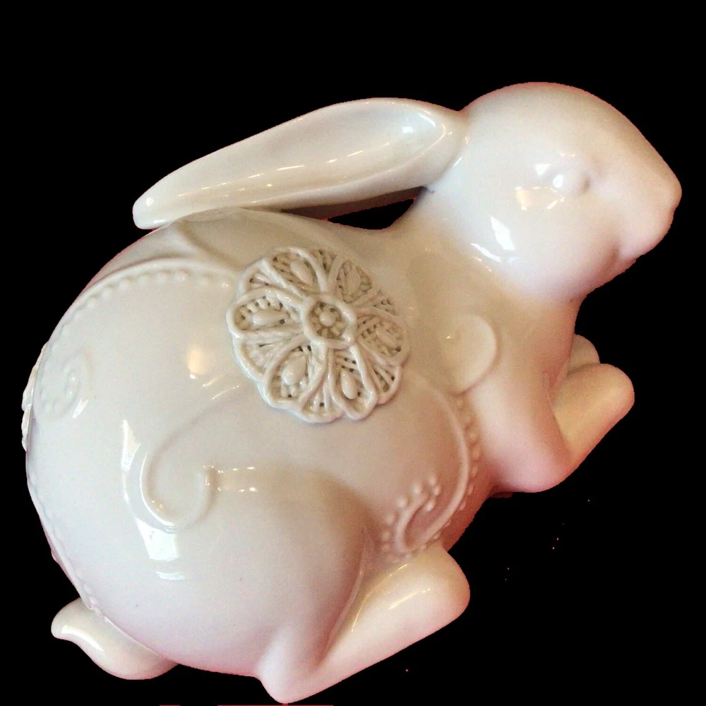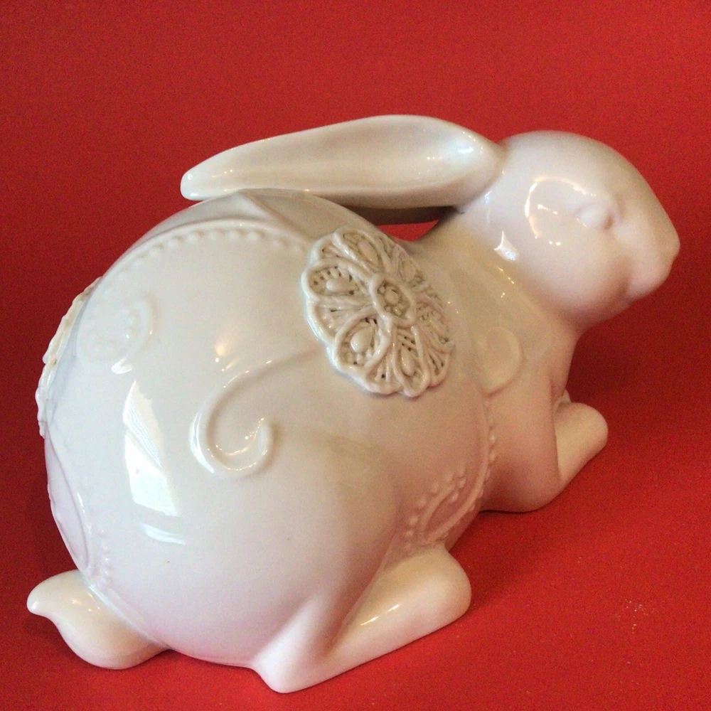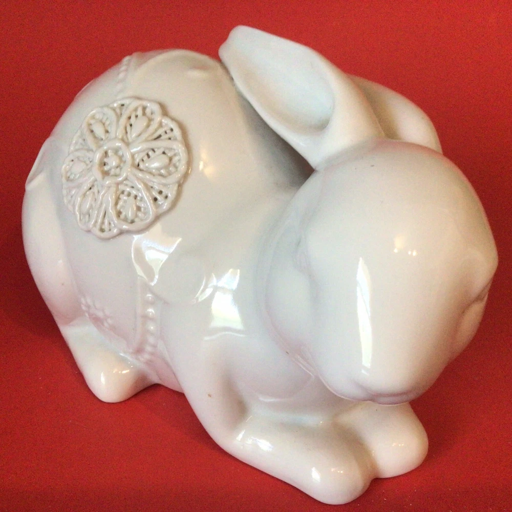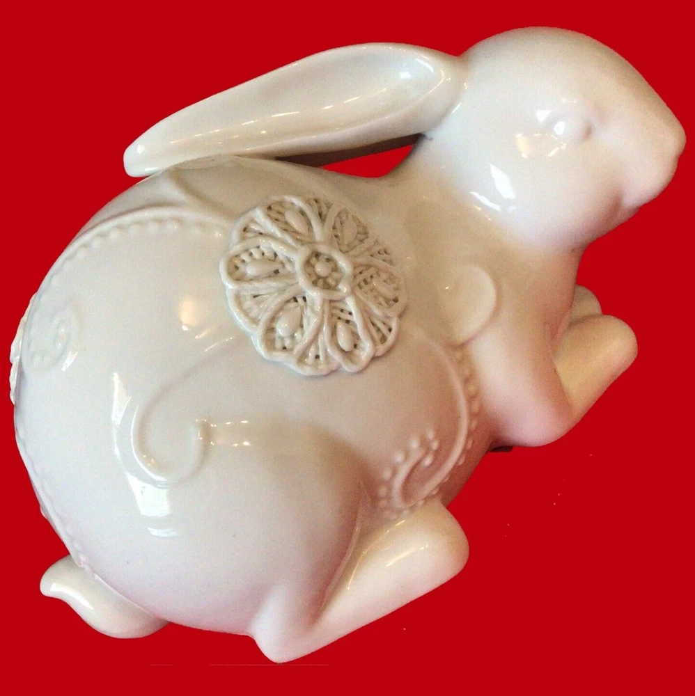 GORGEOUS WHITE PORCELAIN BUNNY RABBIT FIGURINE. NORMAL MANUFACTURER TEENY GLAZE DOTS. MEASURES 8 INCHES LONG AND 5 INCHES TALL. VERY UNIQUE. IF YOU HAVE ANY QUESTIONS OR WOULD LIKE MORE PHOTOS, PLEASE MESSAGE US. THANK YOU SO MUCH FOR SHOPPING WITH US! WE ENCOURAGE YOU TO CHECK OUT OUR CUSTOMER REVIEWS. CHECK OUT AND FOLLOW OUR STORE FOR MORE GREAT ITEMS AS WE ADD TO OUR INVENTORY ALMOST DAILY. http://stores.ebay.com/wootieswonders THANKS AGAIN. KEN AND CAROL