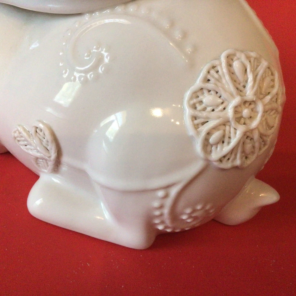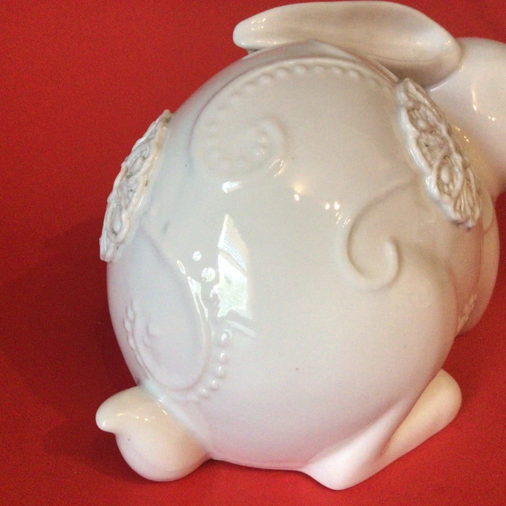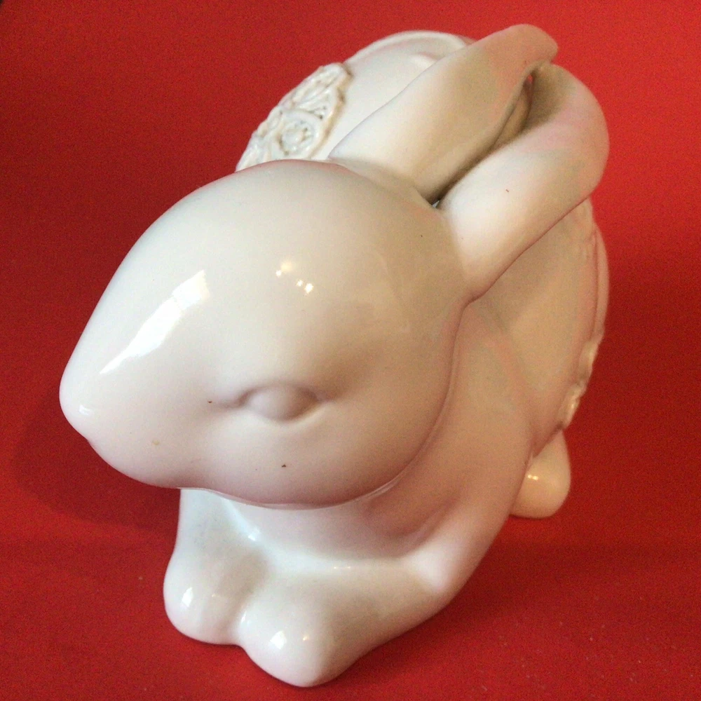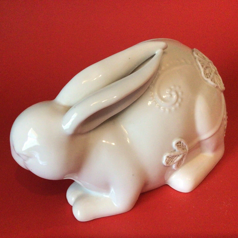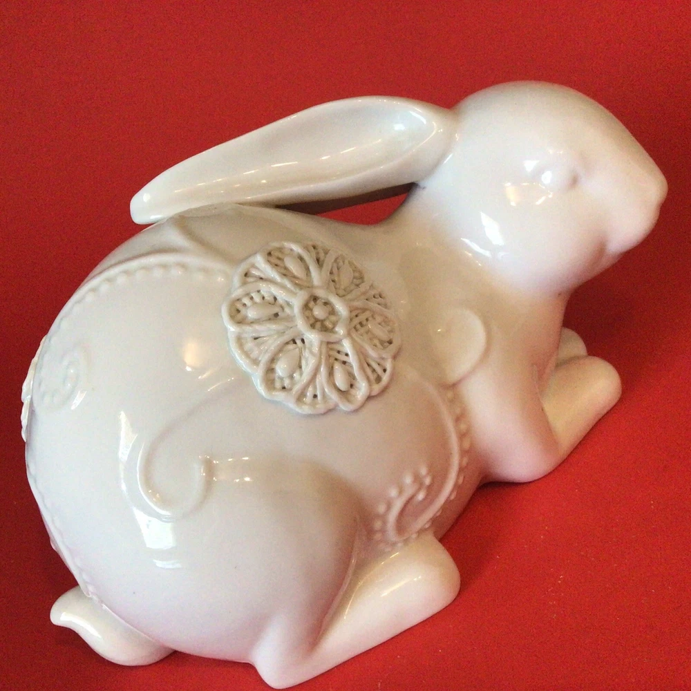 GORGEOUS WHITE PORCELAIN BUNNY RABBIT FIGURINE. NORMAL MANUFACTURER TEENY GLAZE DOTS. MEASURES 8 INCHES LONG AND 5 INCHES TALL. VERY UNIQUE. IF YOU HAVE ANY QUESTIONS OR WOULD LIKE MORE PHOTOS, PLEASE MESSAGE US. THANK YOU SO MUCH FOR SHOPPING WITH US! WE ENCOURAGE YOU TO CHECK OUT OUR CUSTOMER REVIEWS. CHECK OUT AND FOLLOW OUR STORE FOR MORE GREAT ITEMS AS WE ADD TO OUR INVENTORY ALMOST DAILY. http://stores.ebay.com/wootieswonders THANKS AGAIN. KEN AND CAROL