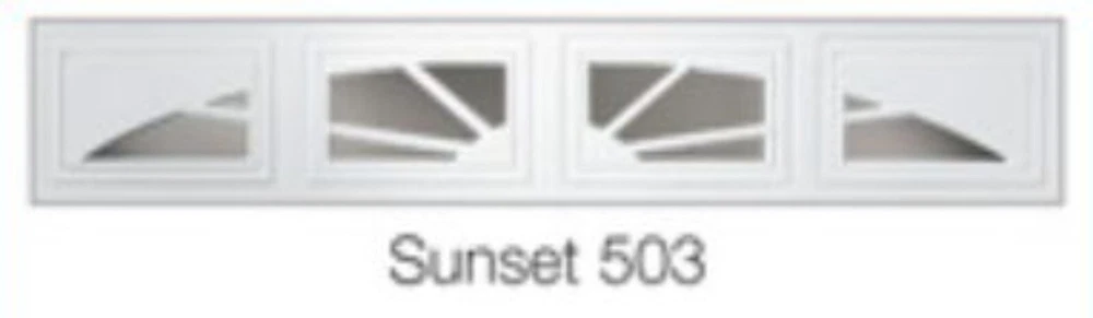 Clopay STANDARD SHORT PANEL Window Insert White SUNSET 503 ( Set of 4 ) Plastic Pattern InsertS ONLY NO GLASS, NO WINDOW FRAMES. For Clopay Doors with short panel windows, Genuine Clopay Part. These will only fit in Clopay Garage Doors with STANDARD Short Panel Windows already installed. This Set of 4 White window inserts has a Sunset pattern that is spread across 4 windows, use 1 set for a single wide door with only 4 windows, if the door has 8 windows across, use 2 of these sets across your door. 18 1/8" x 10 5/8" Outside to Outside Edge of Inserts Please Measure to be sure of fitment, Confirm with CLOPAY CORPORATION if in doubt. Add Instant Curb Appeal Easy to Install, Pop In Design Wood Grain Detail UV Inhibitors Help Reduce Fading Single Injected Molding for Durability