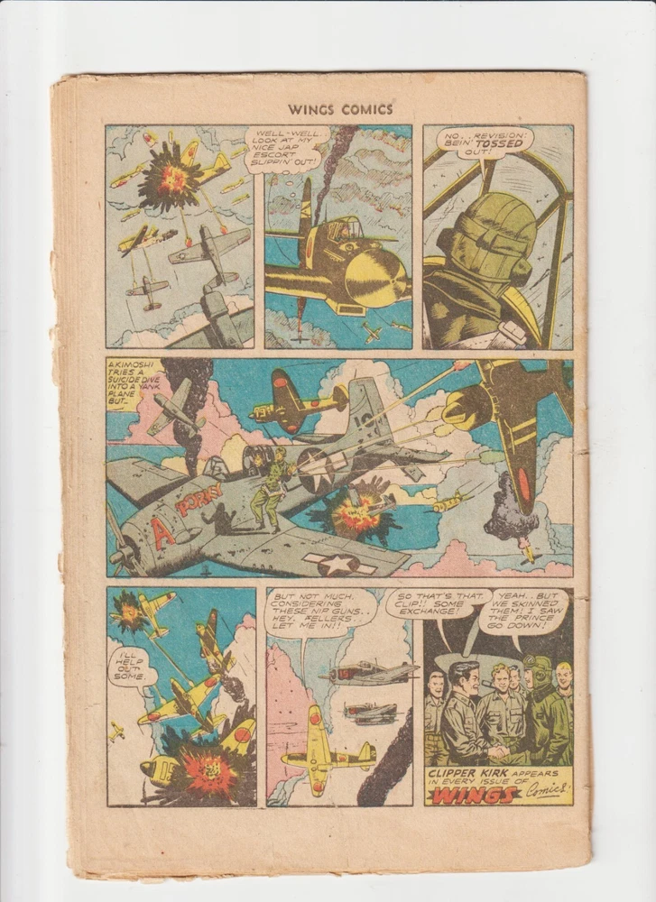Style:ColorPublication Year:1942Personalized:NoIntended Audience:General AudienceVintage:YesType:Comic BookEx Libris:NoLanguage:EnglishCharacter:CAPTAIN WINGSPublisher:Fiction HouseTradition:US ComicsFormat:Single IssueUnit of Sale:Single UnitSeries Title:WingsSigned:NoEra:Golden Age (1938-55)Inscribed:NoSeller Notes:“LOWER GRADE FILLER, NO BACK COVER, SOME EDGE WEAR, , IT IS COMPLETE”Country/Region of Manufacture:United StatesIssue Number:50Grade:1.0 FairGenre:War