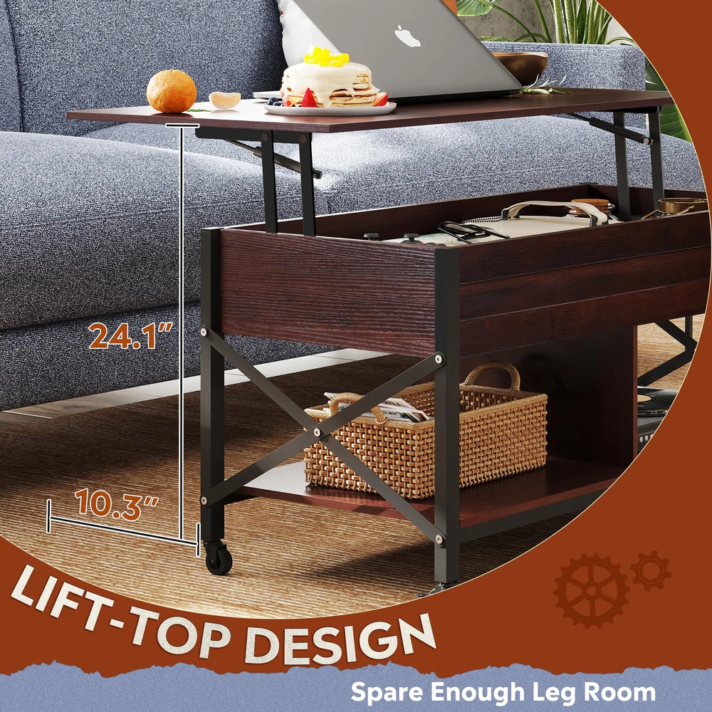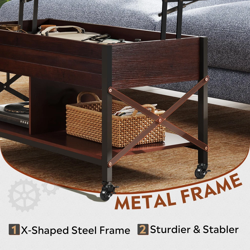 【LIFT-TOP Design】 Our coffee table features a sturdy lift-top design that effortlessly raises and lowers with stability and safety in mind. Crafted with a robust metal framework, it ensures durability while providing a secure platform for your belongings. 【Spacious Storage】With a hidden compartment and two open shelves, this coffee table offers plenty of room to stash away essentials. Whether it's laptops, books, or gaming gear, you'll find the storage both generous and reliable. 【Product Dimension】Measuring at 19.69"D x 41.34"W x 20.2"H, this table is just the right fit for your living space. Plus, it can handle up to 11 lbs on the lift top and a whopping 44 lbs in the hidden compartment, making it both practical and versatile. 【Sturdy and convenient】Crafted from high-quality MDF board and a robust metal frame, this coffee table is built to last. It features four caster wheels and four adjustable feet at the bottom, allowing for easy movement and protecting your floors from scratches. 【Easy to Install】With the included detailed assembly instructions, tools, and clearly marked parts, you can complete the installation in just 30 minutes. If you have any questions, our customer support is always here to help.