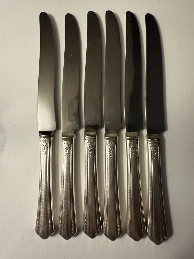 Elevate your dining experience with the WM Rogers Silver Plate Set of 6 Dinner Knives, a testament to classic elegance and craftsmanship. Each knife in this set boasts the fine attention to detail and superior quality that is synonymous with the WM ROGERS and son brand, known for their exceptional silverplate tableware. This set of antique silver plated flatware is a striking addition to any table setting, perfect for those who appreciate the beauty and heritage of silverware. The sophisticated design and durable composition ensure these knives are not only a visual delight but also a practical choice for daily use or special occasions.