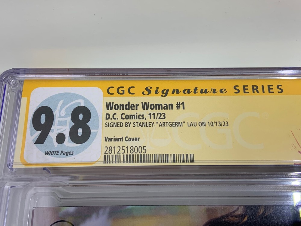 Wonder Woman (2023) #1 CGC Graded 9.8 Stanley "Artgerm" Lau variant, signed by the cover artist Artgerm. Also has Artgerm's custom CGC label on the top. ITEM WILL BE PACKAGED TO ENSURE GREAT CONDITION: SHIPPING: You have the option of shipping using USPS Priority, UPS or FedEx. Shipping worldwide is also available via eBay International Shipping. All packages will receive a tracking number. COMBINED SHIPPING: Most items I have listed are eligible for combined shipping. Please wait to receive your invoice before paying if you want combined shipping prices. No discounts will be granted on combined shipping if you pay before the corrected invoice is received as I still have to pay the eBay fees from the original transaction. RETURNS: There is a 30-day return policy with a refund on the purchase price. Shipping costs are not refundable. Bidder pays any return fees to ship back product unless other wise worked out with the seller.