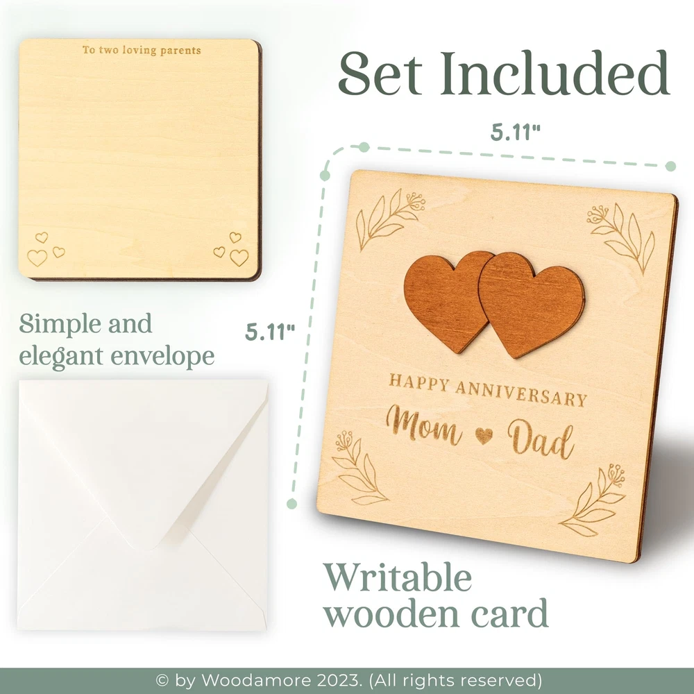 UNIQUE ANNIVERSARY GIFT FOR PARENTS: Celebrate your parent's happy day together with our happy anniversary cards for parents, ideal as wedding gifts for parents from son and daughter PREMIUM SET: You will receive a sturdy wooden card (5.11”x5.11”) with 2 wooden heart puzzles on top to write the names on, making the happy anniversary mom dad card more romantic. A lovely envelope is included for an elegant outlook LOVE KEEPSAKE: The back of this anniversary card for mom or dad is where you can you can write, draw, add photos and freely express your love to your parents, great present ideas for mom dad anniversary gifts from kids HIGH QUALITY: Made of quality wood with fine laser-cut, the greeting card anniversary parents is the best anniversary gifts for parents from daughter and son PERFECT DECORATION: With nice engraved frame and design, our parents anniversary card from us can be placed on the shelf or bedside as wedding keepsake