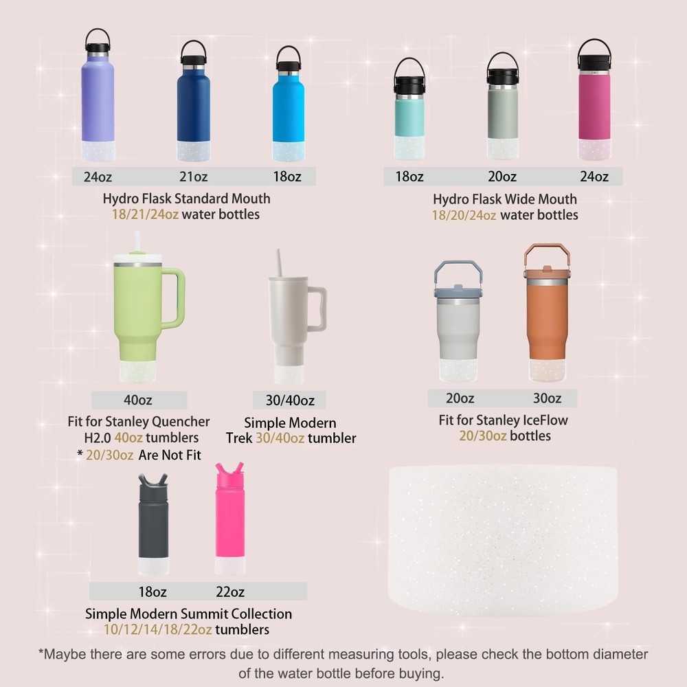 WORBSS Glitter Silicone Boot Sleeve for Stanley Cup H2.0 40oz Accessories & Hydro Flask 18-24oz with 2.85-3.0 inch Anti Slip Bottom Cover Bumper for Water Sport Bottles Personalized Identification Product Details Color: Double Transparent Silver Brand: TLCFSHANGJIA MPN: Boot-Double Silver UPC: Does not apply EAN: Does not apply Brand: TLCFSHANGJIA Material: Silicone Bottle Type: Standard Bottle Color: Double Transparent Silver Capacity: 1.5 Pounds Brand: TLCFSHANGJIA Material: Silicone Bottle Type: Standard Bottle Color: Double Transparent Silver Capacity: 1.5 Pounds Special Feature: Non-Slip Product Care Instructions: Hand Wash Only Model Name: Boot-03 Recommended Uses For Product: General liquid consumption during sports and outdoor activities Number of Items: 2 Reusability: Reusable Shape: Cylindrical Style: Decorative Unit Count: 2.0 Count Specific Uses For Product: General liquid consumption during sports and outdoor activities Item Weight: 0.09 Kilograms Manufacturer: TLCFSHANGJIA Part Number: Boot-Double Silver Item Weight: 3.2 ounces Package Dimensions: 5.59 x 4.72 x 2.76 inches Item model number: Boot-Double Silver Pattern: Solid Special Features: Non-Slip Batteries Included?: No Batteries Required?: No Date First Available: September 6, 2023 Material Description - This boot is made of high quality food grade silicone material, with ornamental pvc scrap-foil, soft, flexible and durable, safe for all ages Snug Fitting - Our Silicone boot fits Most Vacuum Sealed Water Bottles, such as 20 30 40 oz Stanley Quencher H2.0 (Boot Size: 2.87inch inside diameter, 1.70 inch high) it designed to provide the perfect fit for a wide variety of bottles for Stanley Adventure Quencher Tumbler/Yeti Rambler/Owala/Hydro Flask/Simple Modern/Iron Flask/MaxBase Tumbler/(Not all oz sizes are applicable), which perfectly fits the cup bottom and won't fall off easily Safe - Your Stanley cup or other types of water bottles are precious and should be protected at all costs. Our durable twinkled bottom boot helps protect against dents, dings, drops and damage done from accidental thumps. It eliminates loud noises when placing bottles on hard surfaces and makes sure they stay safe when you're on the go Fashion Desing - Our glitter silicone bottle boot are available in a wide variety of colors and designs allowing them to double as functional decorative pieces to add a stylish touch to your look. Theyre ideal for sports and all your outdoor activities Perfectly Gifts - You will get 2 pack of glitter boots for yourself, family, friends, or for spare. Suitable both for the elderly, adults and children, perfect water bottle accessories for stanley tumblers, and the first choice for holiday gifts! (The bottle is not included) Note - Due to the use of different environments and light, the actual color may have a certain error with the picture. The boot 's surface may have sporadic sequins fall off, is a normal phenomenon. Warning: Do not use the boot to hold food or water, or you will ingest debris
