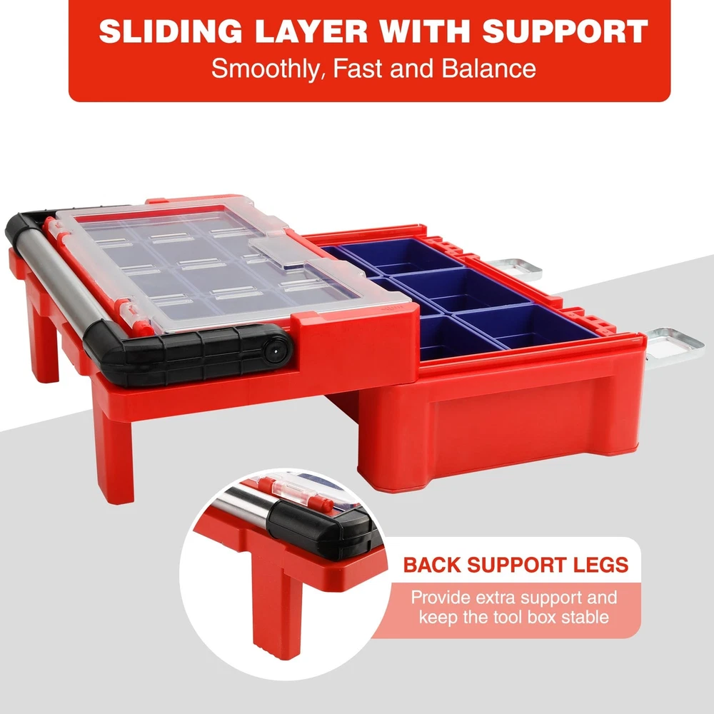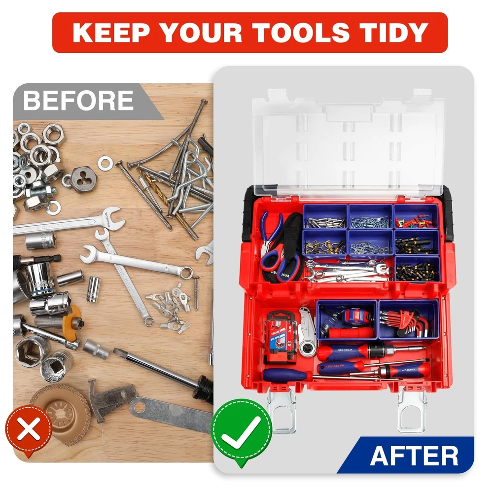 WORKPRO 17-inch Plastic Tool Box, Red Storage Box with Locking Lid and Stainless Steel Handle, 18 Adjustable Compartments for Sockets, Crafts and Power Tools, Great Father Day Gifts Product Details Brand: WORKPRO Material: Stainless Steel, Plastic Color: Red Product Dimensions: 17"L x 5"W x 9"H Water Resistance Level: Water Repellent Brand: WORKPRO Material: Stainless Steel, Plastic Color: Red Product Dimensions: 17"L x 5"W x 9"H Water Resistance Level: Water Repellent Maximum Weight Recommendation: 80 Kilograms Number of Compartments: 18 UPC: 820909758877 Global Trade Identification Number: 77 Manufacturer: HANGZHOU GREATSTAR INDUSTRIAL CO.,LTD Item Weight: 5.66 pounds Item Package Quantity: 1 Batteries Included?: No Batteries Required?: No Date First Available: November 20, 2019 Movable Box with Lid: The tool box contains 18 movable compartments with a transparent cover. All compartments are easily put in and out to customize the storage case. The transparent lid allows you to see everything at a glance Metal Lock Catch & Handle: The Lock catch is solid and firm to provide safety, while the widened handle provides convenient and portability Sliding Layer with Support: The special sliding design provides as much access space as possible. It is more convenient to select parts Durable Material with Stiffener: The box is made of PP material with a widened stainless steel handle. The stiffener structure ensures the throw resistance and load-bearing Dimensions & Function: The tool box dimensions: 17" x 9-1/2" x 5-5/8". It is perfect for sockets, bits and other accessories storage