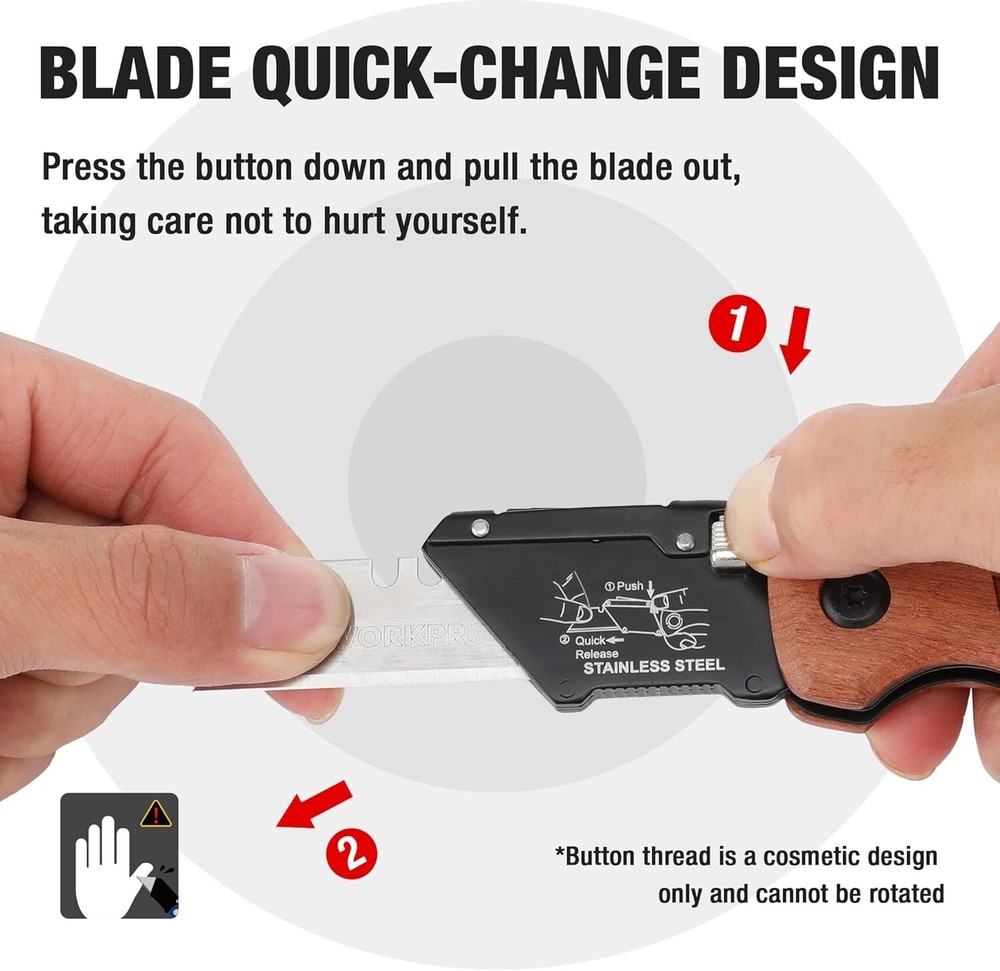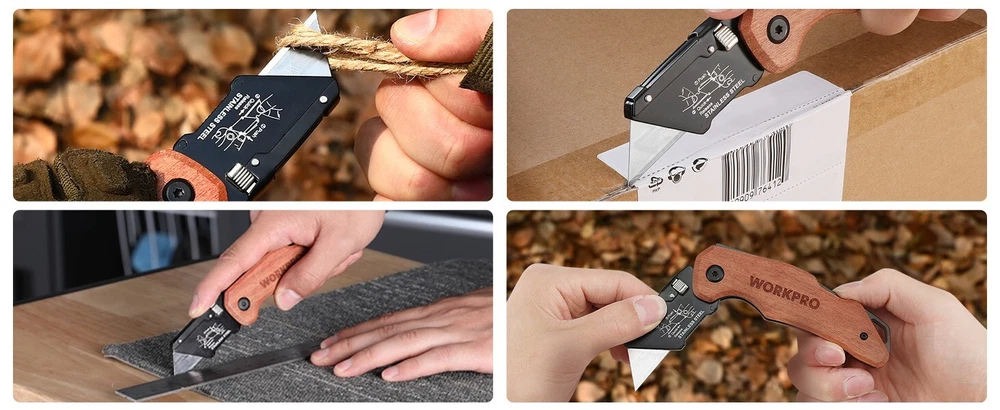 This WORKPRO utility knife is a game-changer! The quick-change blade system makes swapping blades effortless, and the sturdy wooden handle gives a solid, comfortable grip. The heavy-duty build handles tough jobs with ease, while the secure back lock keeps the blade in place for safe, precise cuts. Plus, the 10 included SK5 blades mean you're set for a long time. Perfect for home, warehouse, or job site use—highly recommend!