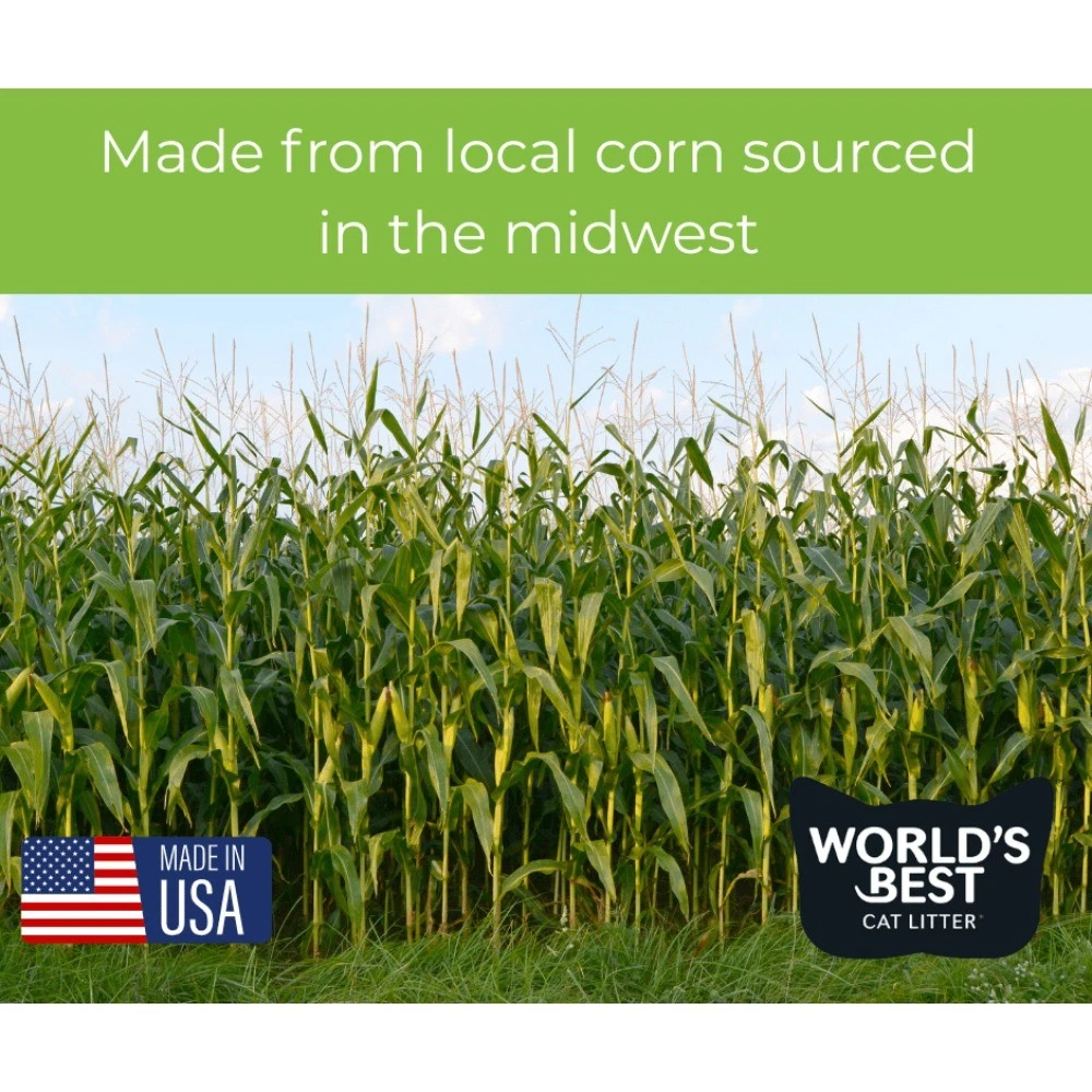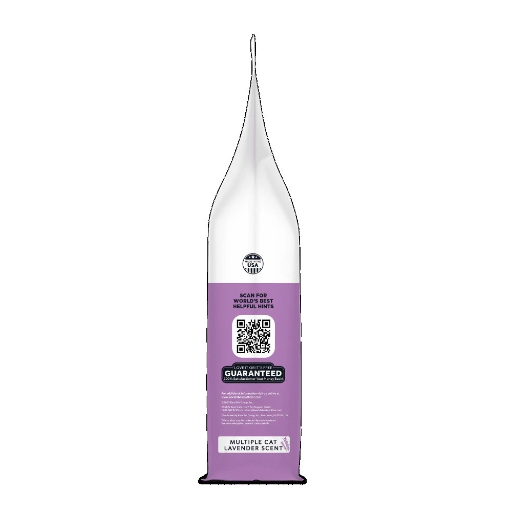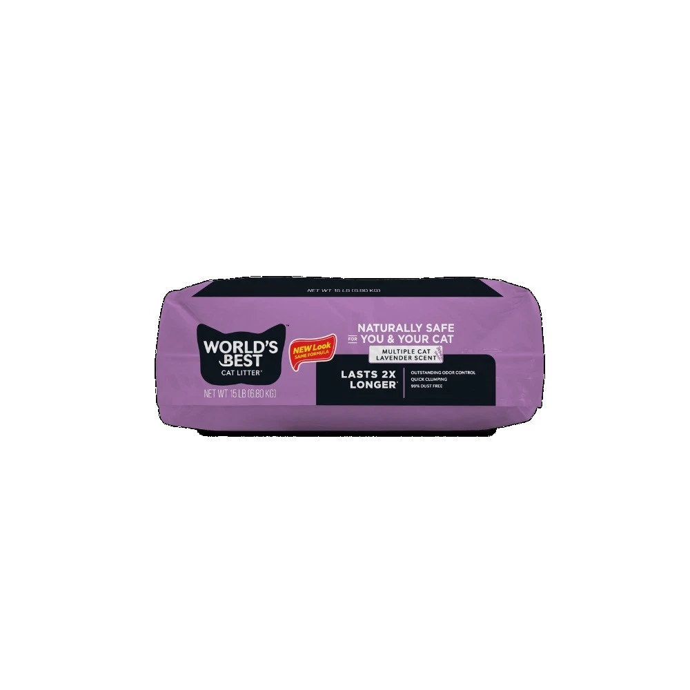 World’s Best Cat Litter® Multiple Cat Lavender Scent formula – the perfect choice for those who prefer a fresh scent in their litter. Made from whole-kernel corn, this formula is similar to the Multiple Cat Unscented formula but includes a natural lavender oil blend for a pleasant fragrance. All World’s Best Cat Litter® formulas are crafted from natural, renewable ingredients, free from harmful chemicals, synthetic perfumes, or clays. Our advanced, patented process harnesses the natural absorbency of renewable ingredients, ensuring our litter is pet-, people-, and planet-friendly. The lavender fragrance is derived from plant-based oil and contains no synthetic ingredients, providing a fresh scent without harming your pets. If your pet shows any adverse reactions or begins to eat the litter, discontinue use immediately. The fragrance may dissipate over time, but the litter will continue to perform effectively. Store unused portions in a cool, dry place, sealed in the bag or bin. All World’s Best Cat Litter® formulas are rigorously tested to be sewer- and septic-safe, allowing you to scoop, flush, and move on with your day. Choose Multiple Cat Lavender Scent formula for a naturally fresh, effective, and sustainable litter solution. NEW LOOK, SAME FORMULA: Our bag’s getting a makeover, but our purrfect litter stays unchanged! The same formula, the same litter and the same great clump. New look coming soon. OUTSTANDING ODOR CONTROL — More cats shouldn’t mean more smells — keep your cats happy with a natural litter with long-lasting odor control. QUICK CLUMPING & EASY SCOOPING — No more chiseling and scraping thanks to a fast-acting natural litter that leaves less mess in and around your litter box. LIGHTWEIGHT & 99% DUST FREE — Naturally free of silica dust, this lightweight cat litter offers low tracking and less mess — so you and your cat can breathe easy. For the best results, do NOT mix with a non-clumping litter. PET, PEOPLE & PLANET FRIENDLY — A naturally safe litter made from whole-kernel corn that offers no harmful chemicals and no artificial perfumes.