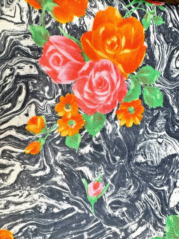This is for 2 yards of Vintage Polyester Double Knit 62" Fabric. CRAZY Black Marbeling with Pink, Orange, & Green Roses. Unused and carefully stored. Please see pics for condition. No odors. Buyer pays $7.50 s/h. Thanks for looking!