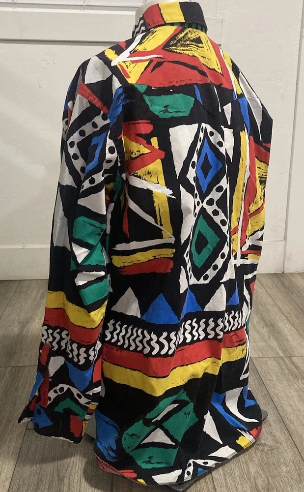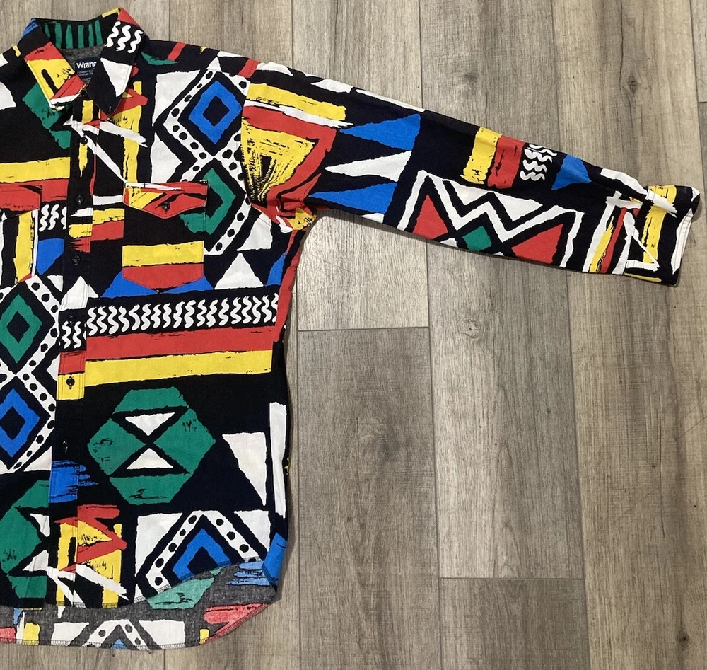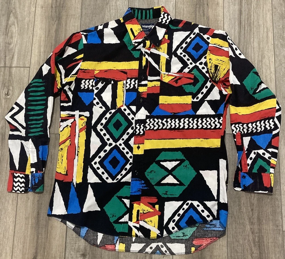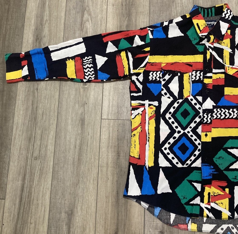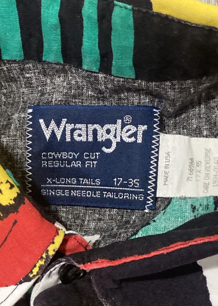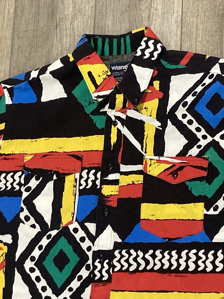 WRANGLER 90’s southwest/cowboy shirt multi-color, button down long sleeves shirt with two front pockets. cowboy cut regular fit men’s size Large 17x35 pre-owned in good condition