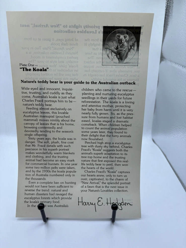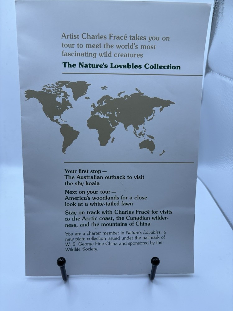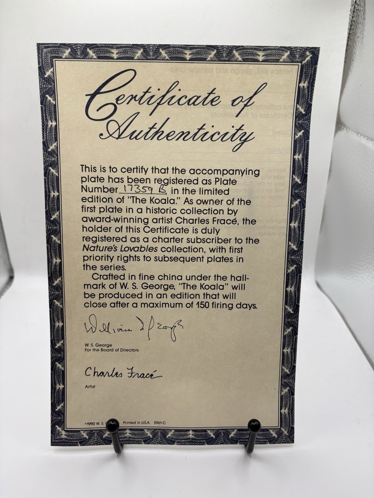 Delve into the charming world of collectibles with the W.S George Fine China Collector Plate, featuring the adorable Koala design by renowned artist Charles Frace. Crafted from premium porcelain, this piece showcases exceptional craftsmanship and attention to detail, making it a prized addition to any collection. This is a first edition. Certificate of authenticity (17359 B) and brochure provided