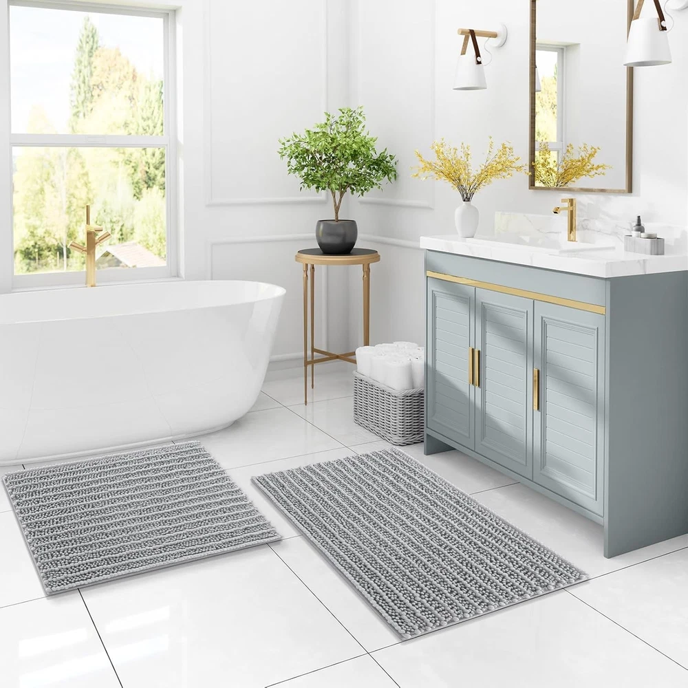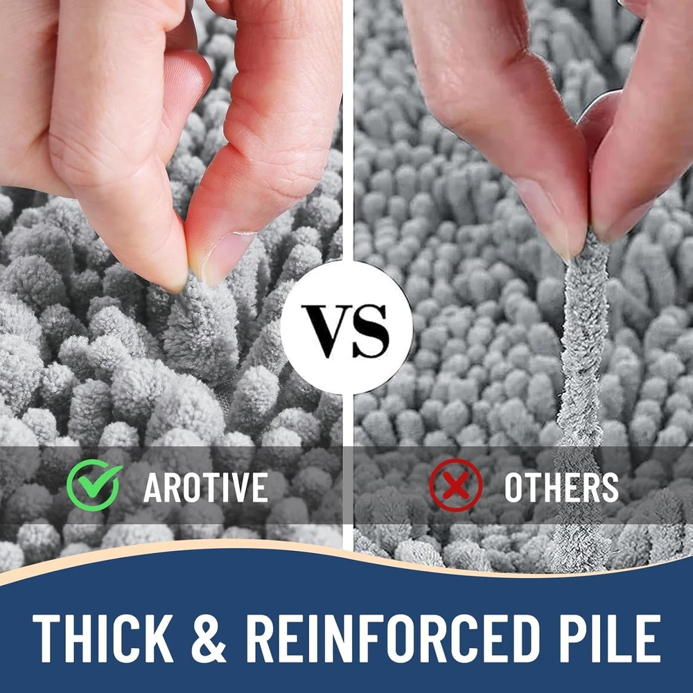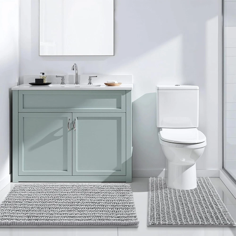 Chenille Ultra Plush and Comfortable: Experience ultimate comfort with luxury bathroom rugs that feature a plush 0.86-inch microfiber pile. Designed for a soft, cozy feel, these rugs soothe tired feet and provide a warm barrier against cold floors. Every step out of the shower or bathtub will be met with a cushioned, luxurious sensation Water Absorbent: Crafted with deep piles of ultra-soft microfiber shags, our shaggy bath rugs excel in absorption. The thick chenille fabric swiftly absorbs water, stopping floors from getting wet as you step out of the bath, shower, or prepare by the sink. Moisture is effectively trapped within the mat's high pile, ensuring rapid and thorough drying, leaving your bath rug clean and fresh Non Slip Backing: The chenille bathroom rugs are equipped with a non-slip bottom made of sturdy mesh PVC material, ensuring the bath mat remains in place and stops shifting or skidding. WARNING: Place mat on CLEAN DRY SMOOTH FLOOR only. Keep bottom of mat dry. Before using bath carpet, test with foot to ensure it doesn't move Easy to Clean: Cleaning these chenille bath mats is a breeze. Simply toss them in the washing machine with cold water and a mild detergent, then either tumble dry on low speed or hang them to air dry. Even after multiple washes, the color of the bathroom rug remains vibrant and won't fade. Thanks to the soft microfiber material, the rugs won't shrink or become rough after washing, ensuring they maintain their plushness for a long time Create Your Home Oasis: The U-shaped toilet mat serves several functions in a bathroom setting. Its design is tailored to fit around the base of the toilet, offering cushioning for your feet while using the toilet. This can enhance comfort, especially during longer bathroom sessions. These toilet mats come in various colors, adding a decorative touch to the bathroom and coordinating with other bath accessories to create a cohesive look Previous page Next page