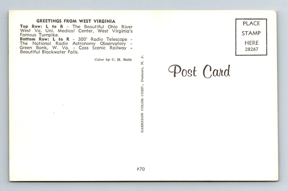 Region: West Virginia Type: Printed (Lithograph) Country/Region of Manufacture: United States Era: Chrome Subject: Cities & Towns Country: USA Continent: North America Postage Condition: Unposted City: West Virginia Theme: Cities & Towns Unit of Sale: Single Unit Original/Licensed Reprint: Original