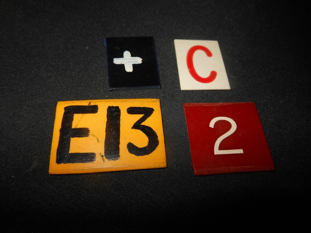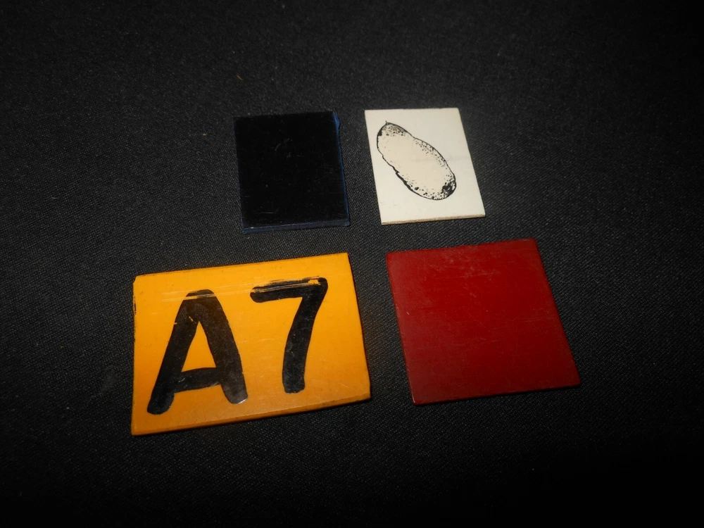 You are bidding on a VERY NICE and 100% original set of WW2 British Royal Air Force Operations Room Map Tiles! Used on large maps, these indicated the position of both friendly and enemy aircraft during a raid. Map counters were used in RAF Filter and Sector Ops rooms during the Battle of Britain and beyond to display important information relating to an enemy raid. When details of aircraft were received at Group Filter room level, it was interpreted on a map table using plotting 'counters' in the form of colored arrows, discs and shields. Arrows indicated aircraft seen over land by Observers or over sea by radio location. Shields indicated aircraft heard over land or sea by Observers and Discs indicated circling aircraft. The color of the plotting pieces related directly to those on the Sector clock such that information was updated every 5 minutes. The raid block itself was normally positioned at the head of the plotting path and provided additional information such as strength, height and whether the aircraft were 'hostile', 'friendly' or 'unknown. Made of plastic, this is an EXCELLENT set! There is some slight marks and wear due to the age, but nothing that detracts. I have shown both the front and back sides of each. Last image depicts these EXACT type of counters in use. A FANTASTIC opportunity to create a small Operations Room display, these would make a PERFECT addition any collection or simply as a conversation piece!