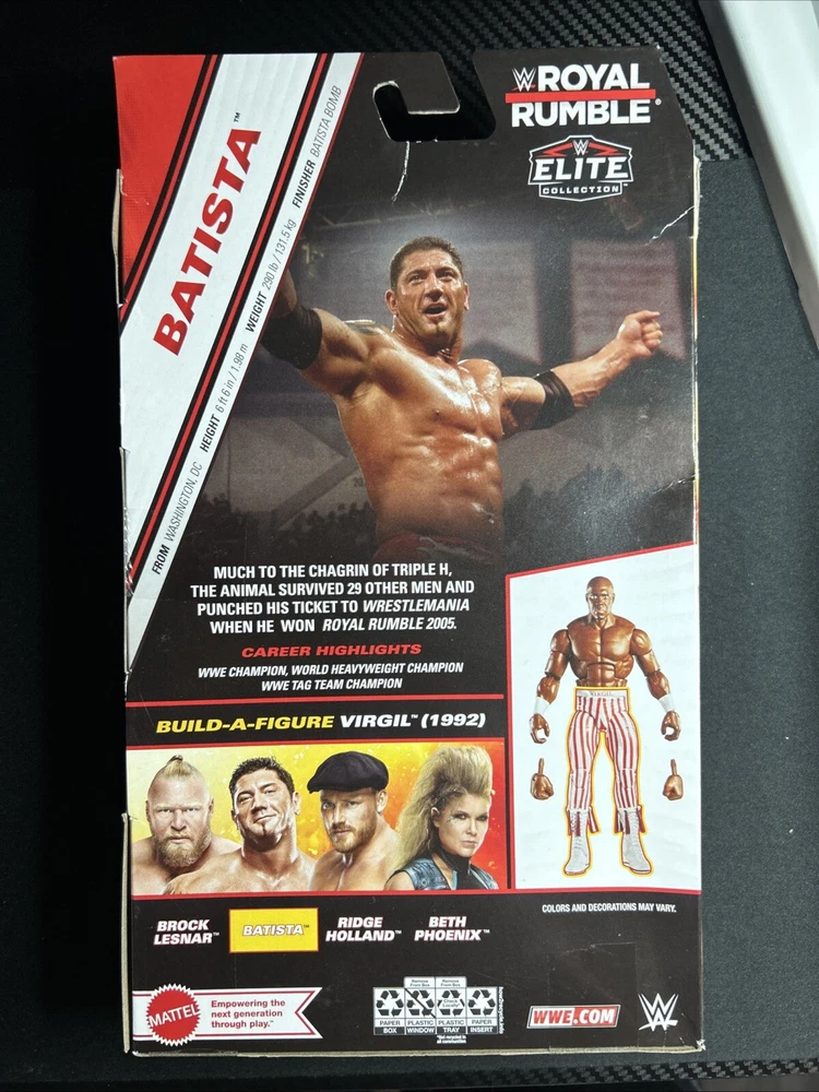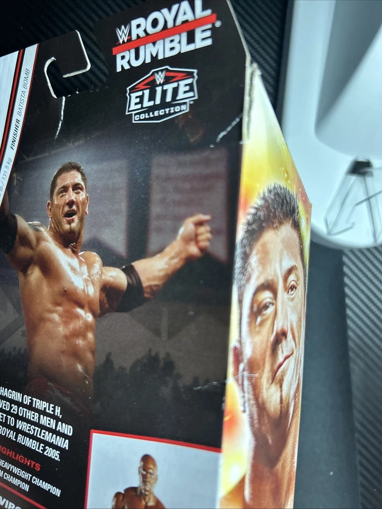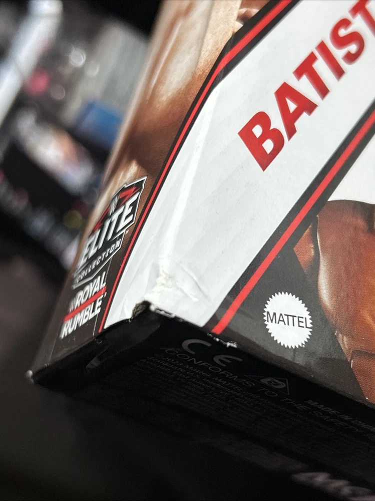 Barista mattel elite royal rumble 2005 attire figure! Box is in fair shape. (See pics) wrinkle and tear on the top left, bottom left has a bad corner. Box has never been opened.