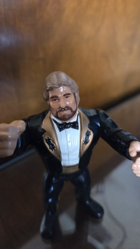 The WWF Hasbro Titan Sports Series 1 Million Dollar Man Wrestling Action Figure is a collectible toy representing the popular wrestler Million Dollar Man. This action figure is part of the sports series by WWF Hasbro, designed in vibrant multi-color attire to resemble the wrestler's iconic look. Perfect for fans of wrestling and collectors of sports memorabilia, this action figure captures the essence of the Million Dollar Man's persona and style in the ring. The figure still looks brand new and I am putting in one of his wrestling cards from the 1989 series. (No Charge)