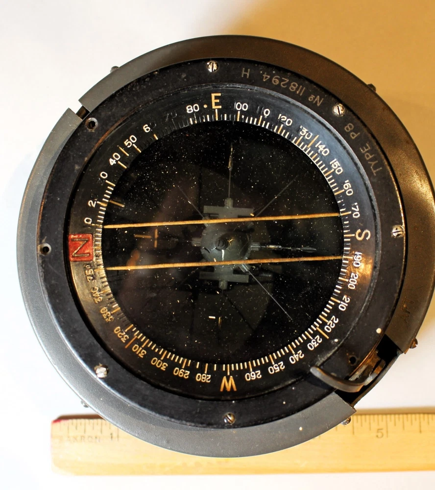 We are offering this great WWII British RAF Type P8 plane's compass that was used on the Spitfire, Hurricane, Bristol Beaufighter and the Mosquito airplanes. It is in very good original condition and accurately shows directions The interior fluid is missing and there are three tiny set screws missing (not altering function of visual appeal), I believe the grey painted housing is brass and that all the other parts are non-ferrous. The compass has an overall diameter of 5 1/2" and a height of 3". I believe it was made c. 1940. It has the serial number 118294. The Air Ministry brass plaque is present and it gives the reference number as 6A/0.726. Stock Number SA2D-421