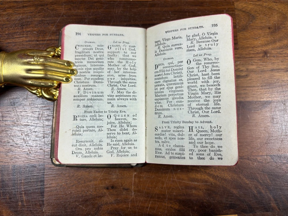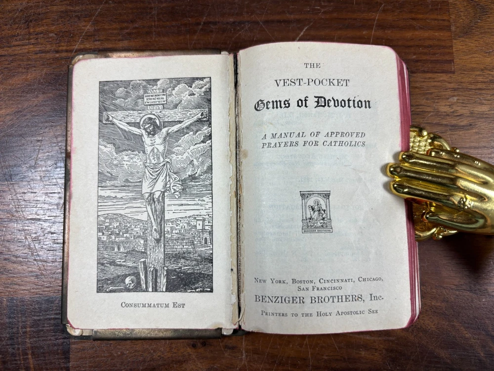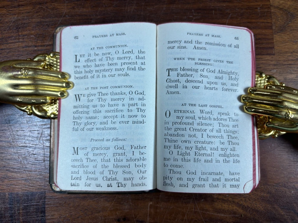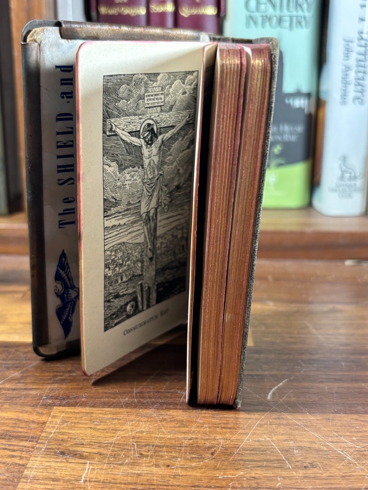 Own a piece of WWII history with this original Heart Shield Prayer Book , a pocket-sized devotional carried by U.S. soldiers during the Second World War. This devotional was presented to "Joseph F Kulb" on 2/14/1944 from "Edith M Kulb" Produced in the early 1940s, these small prayer books were encased in a protective metal “heart shield” cover designed to be worn over the chest. While never truly bulletproof, they offered soldiers spiritual comfort and became deeply meaningful keepsakes during wartime. Details: Authentic WWII-era Heart Shield Prayer, Book Catholic devotional Pocket-sized format Sturdy metal cover with embossed design Original WWII issue Contents: Prayers, devotions, and religious guidance for soldiers in the field Collectible Value: This is a meaningful relic of faith and wartime history, perfect for collectors of militaria, devotional books, or WWII memorabilia. Condition: Corners of various pages have small folds. Metal cover has some tarnishing. All text is 100% legible. Small tear on the leaf with inscription. Dimensions: Weight - 177g Height - 12.5cm Width - 7.75cm Thickness - 1.5cm