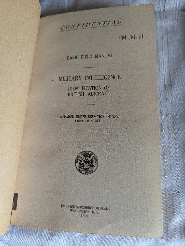 Vintage WWII US Army Air Corps Force FM 30-31, War Department Basic Field Manual, Military Intelligence, Identification of British Aircraft soft bound book. Dated August 1, 1941. 161 pages. Please see the photos. Looking for art glass, china, sterling silver, aviation collectibles? Check our store, we have more! Please ask questions! We combine shipping costs! Priority Mail and Ground Advantage now includes up to $100 of insurance. Check out my store! You will find clothing, accessories, antiques and aviation collectibles – even some stuff for the kids! Item comes from a smoke free, pet free home. Email me if you have any questions! Thanks for looking! A note about feedback: If you are planning to award less than five stars for any of the categories, please email me and let me know if there is an issue. I do my best to start items at the lowest possible price and provide great service. The rating system is how eBay charges the sellers our fees – so it is very important to us! Also, regarding shipping fees, I only charge you what the USPS charges me – no handling fees. The tracking number for your package inside the USA will be emailed to you. International purchases are handled by eBay. I do not end auction items early – ever!! It is not fair to everyone else, so please do not ask! Returns: Please measure your favorite fitting pieces of clothing in your closet and compare the measurements to the listing. If an item does not fit, it is not eligible for return. I do not refund shipping costs. If I have missed something or have grossly misrepresented an item, please contact me through the eBay email system and I will happily consider your item for a refund. Sign up for my newsletter! You will receive updates on new things in my store!