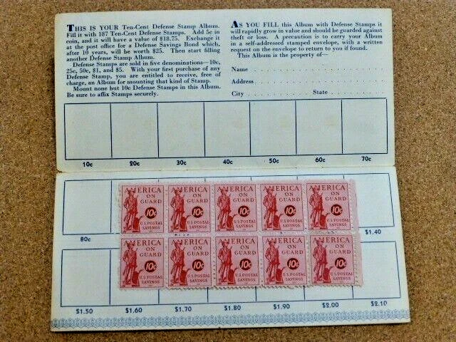 Original World War II 10 Cent Defense Stamp Album for the Purchase of United States Defense Savings Bonds U sed b ook ha s 10 stamps (SeePhotos). The book is in very good used condition .