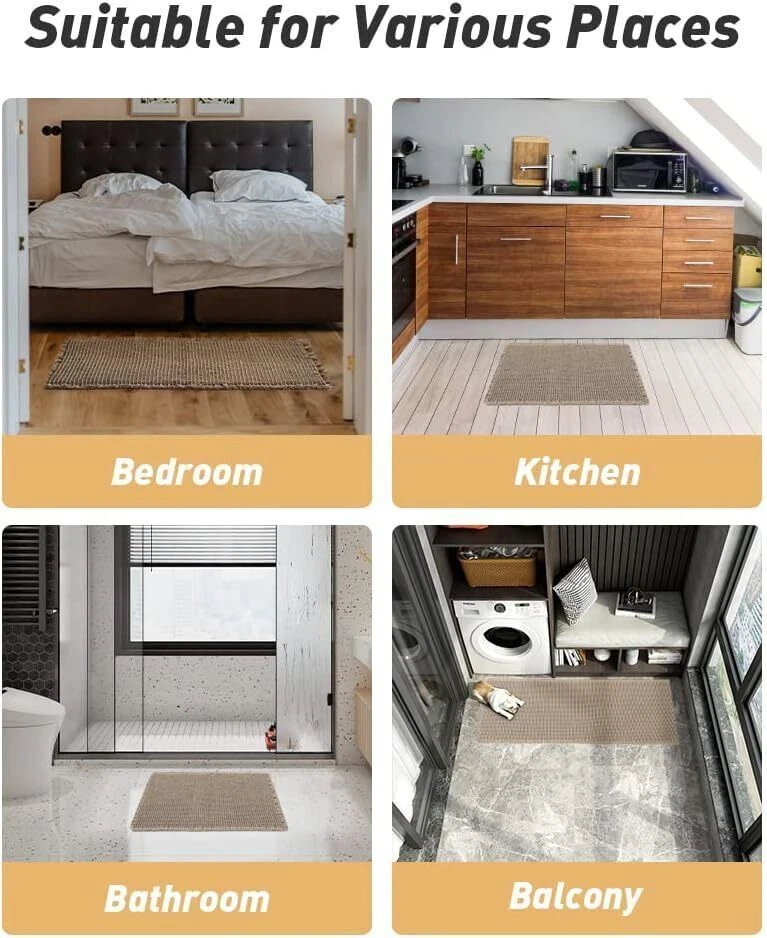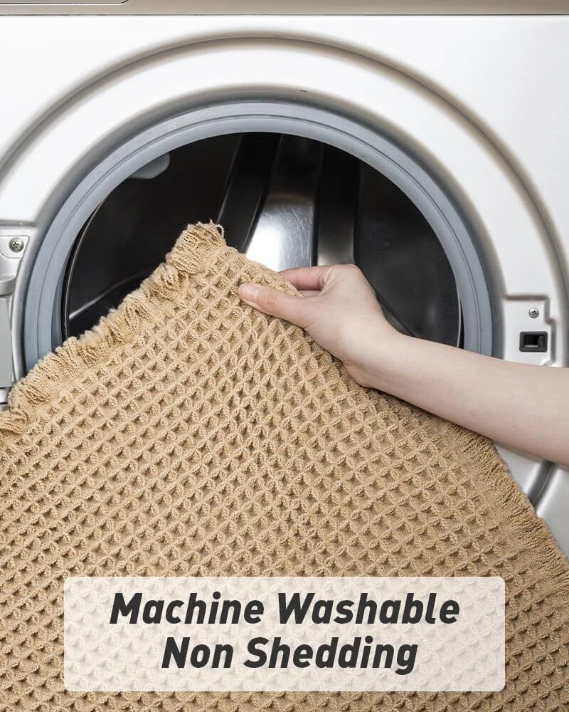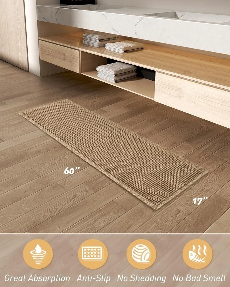 Upgraded Waffle Desgin: This boho bath mat is power-loomed with upgraded yarns-Integrating decoration and durability. The heavier and thicker threads are applied to make sure the pattern will be more solid and compact- NEVER OUT OF SHAPE! Great Water Absorption: Double layer of deep waffle texture absorbs water instantly and more breathable. In addition, the yarns we use is inherently absorbent-it absorb water like crazy. This absorbent bath mat can soak up the water and keep your floor dry like a giant sponge, and protect your feet from the cold floor. Clear Rubber Backing: This non slip bath mat is designed with clear rubber backing(HMA-Hot Melt Adhesive, invisible but touchable). This bathmat firmly grips the ground to prevent you and your families from falling. Comfortable and Soft: Three-dimensional waffle design combined with flexible yarns make the bathroom floor mat softer and cozier. Bring you a comfortable underfoot feeling. Enjoy a comfort space when you finishing shower. Easy to Maintain: Machine washable bathroom rugs provide convenience in your daily life. Recommend gentle mode,cold water. Or just shake the dust off from the bath rugs for simple cleaning. Size 17" x 60" Material Polyester Weave Type Machine Made Pile Height Low Pile Construction Type Machine Made Back Material Type Rubber Color Brown Indoor/Outdoor Usage Indoor Product Care Instructions Machine Wash, Hand Wash Only Pattern Waffle Shape Rectangular Special Feature Absorbent, Lightweight, Quick Dry, Non Slip, Washable Room Type Entryway, Bathroom, Kitchen, Bedroom, Hallway Product Dimensions 60"L x 17"W Rug Form Type Runner Style Boho Occasion Housewarming Seasons Winter, Summer, Fall, Spring Item Weight 1.43 pounds