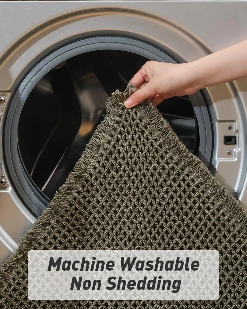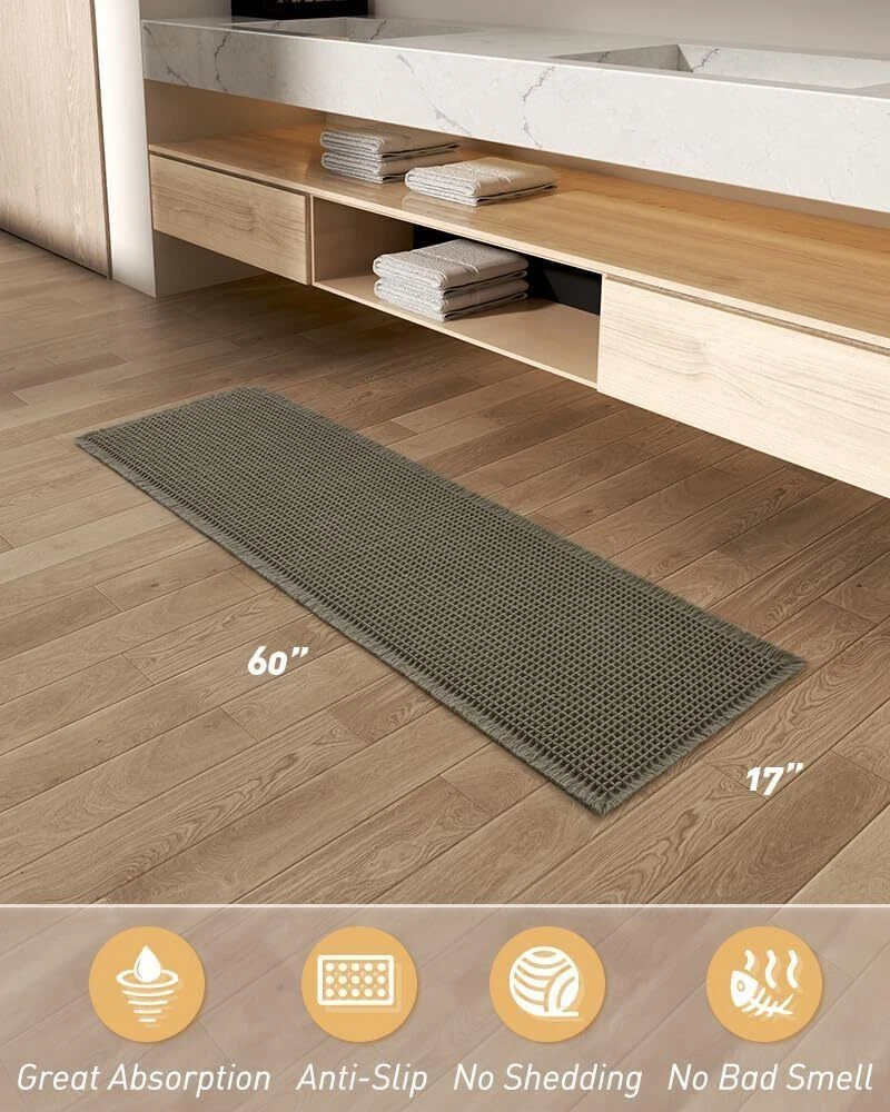 Upgraded Waffle Desgin: This boho bath mat is power-loomed with upgraded yarns-Integrating decoration and durability. The heavier and thicker threads are applied to make sure the pattern will be more solid and compact- NEVER OUT OF SHAPE! Great Water Absorption: Double layer of deep waffle texture absorbs water instantly and more breathable. In addition, the yarns we use is inherently absorbent-it absorb water like crazy. This absorbent bath mat can soak up the water and keep your floor dry like a giant sponge, and protect your feet from the cold floor. Clear Rubber Backing: This non slip bath mat is designed with clear rubber backing(HMA-Hot Melt Adhesive, invisible but touchable). This bathmat firmly grips the ground to prevent you and your families from falling. Comfortable and Soft: Three-dimensional waffle design combined with flexible yarns make the bathroom floor mat softer and cozier. Bring you a comfortable underfoot feeling. Enjoy a comfort space when you finishing shower. Easy to Maintain: Machine washable bathroom rugs provide convenience in your daily life. Recommend gentle mode,cold water. Or just shake the dust off from the bath rugs for simple cleaning. Size 17" x 60" Material Polyester Weave Type Machine Made Pile Height Low Pile Construction Type Machine Made Back Material Type Rubber Color Green Indoor/Outdoor Usage Indoor Product Care Instructions Machine Wash, Hand Wash Only Pattern Waffle Special Feature Absorbent, Lightweight, Quick Dry, Non Slip, Washable Room Type Entryway, Bathroom, Kitchen, Bedroom, Hallway Product Dimensions 60"L x 17"W Rug Form Type Runner Style Boho Occasion Housewarming Seasons Winter, Summer, Fall, Spring Item Weight 1.46 pounds