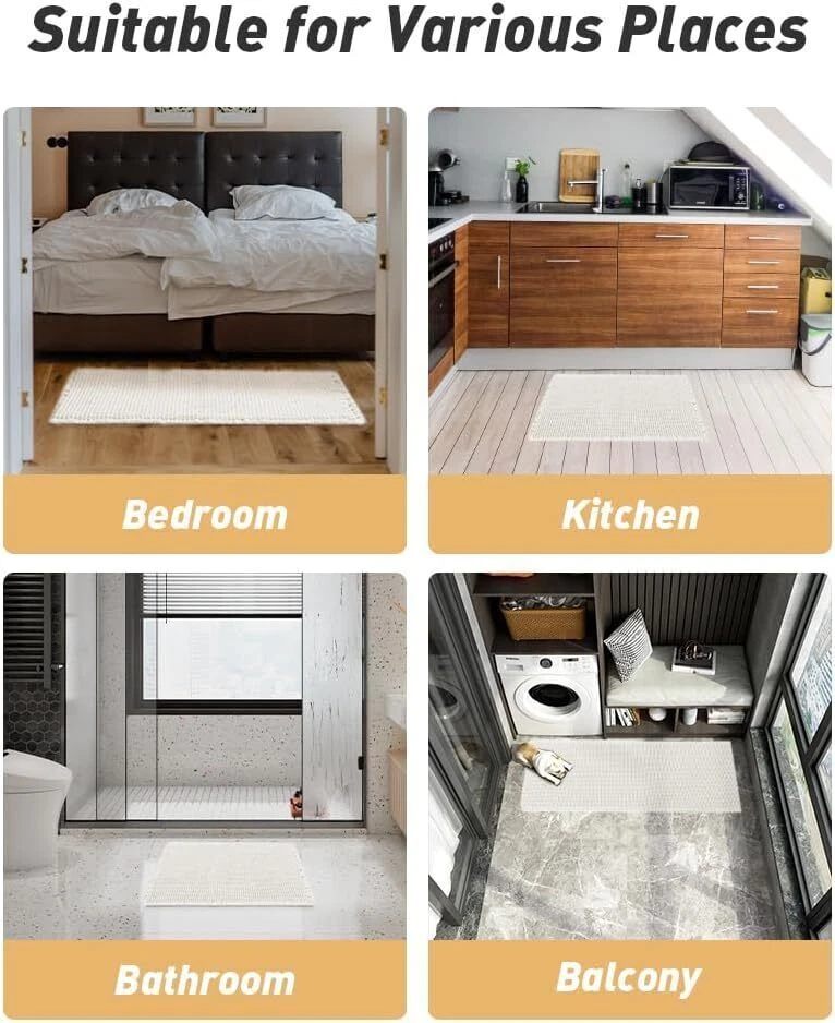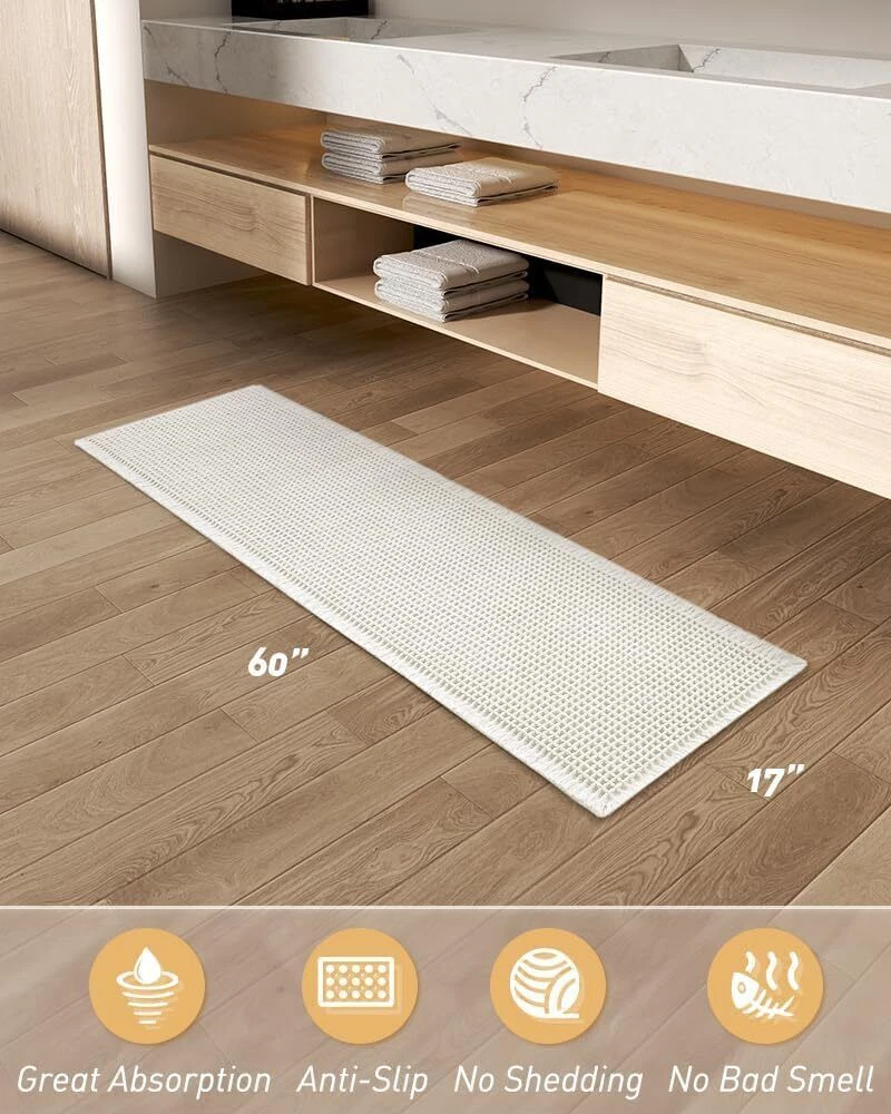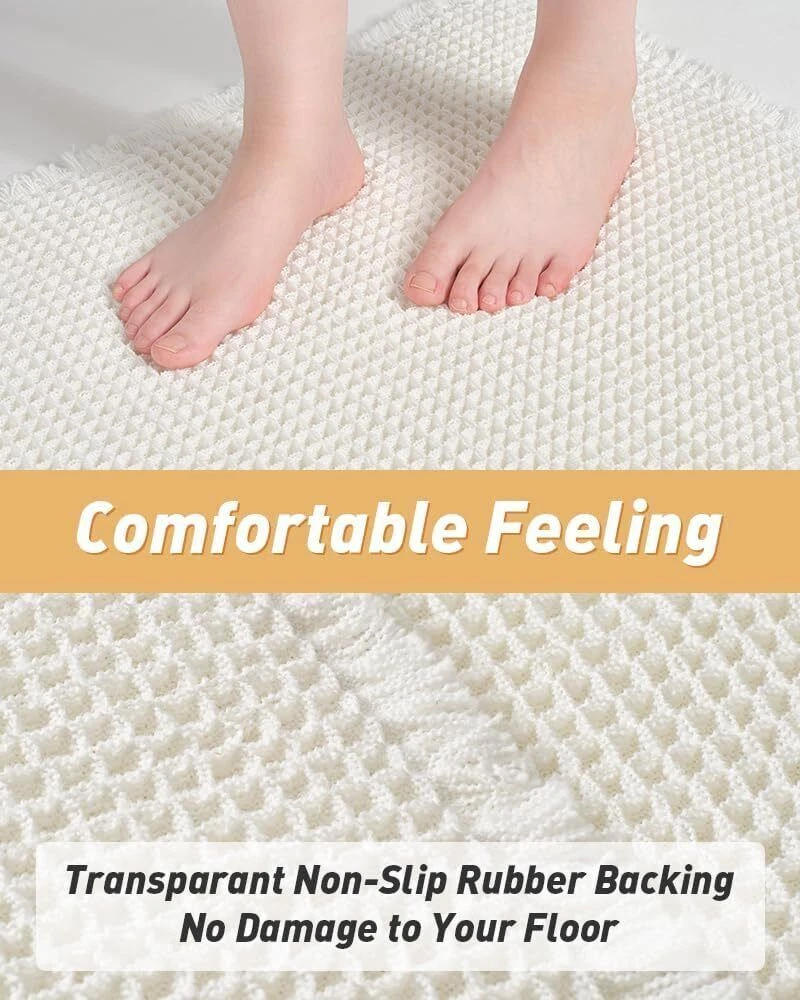 Upgraded Waffle Desgin: This boho bath mat is power-loomed with upgraded yarns-Integrating decoration and durability. The heavier and thicker threads are applied to make sure the pattern will be more solid and compact- NEVER OUT OF SHAPE! Great Water Absorption: Double layer of deep waffle texture absorbs water instantly and more breathable. In addition, the yarns we use is inherently absorbent-it absorb water like crazy. This absorbent bath mat can soak up the water and keep your floor dry like a giant sponge, and protect your feet from the cold floor. Clear Rubber Backing: This non slip bath mat is designed with clear rubber backing(HMA-Hot Melt Adhesive, invisible but touchable). This bathmat firmly grips the ground to prevent you and your families from falling. Comfortable and Soft: Three-dimensional waffle design combined with flexible yarns make the bathroom floor mat softer and cozier. Bring you a comfortable underfoot feeling. Enjoy a comfort space when you finishing shower. Easy to Maintain: Machine washable bathroom rugs provide convenience in your daily life. Recommend gentle mode,cold water. Or just shake the dust off from the bath rugs for simple cleaning. Size 17" x 60" Material Polyester Weave Type Machine Made Pile Height Low Pile Construction Type Machine Made Back Material Type Rubber Color White Indoor/Outdoor Usage Indoor Product Care Instructions Machine Wash, Hand Wash Only Pattern Waffle Special Feature Absorbent, Lightweight, Quick Dry, Non Slip, Washable Room Type Entryway, Bathroom, Kitchen, Bedroom, Hallway Product Dimensions 60"L x 17"W Rug Form Type Runner Style Boho Occasion Housewarming Seasons Winter, Summer, Fall, Spring Item Weight 1.43 pounds