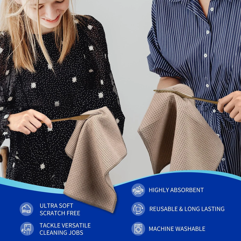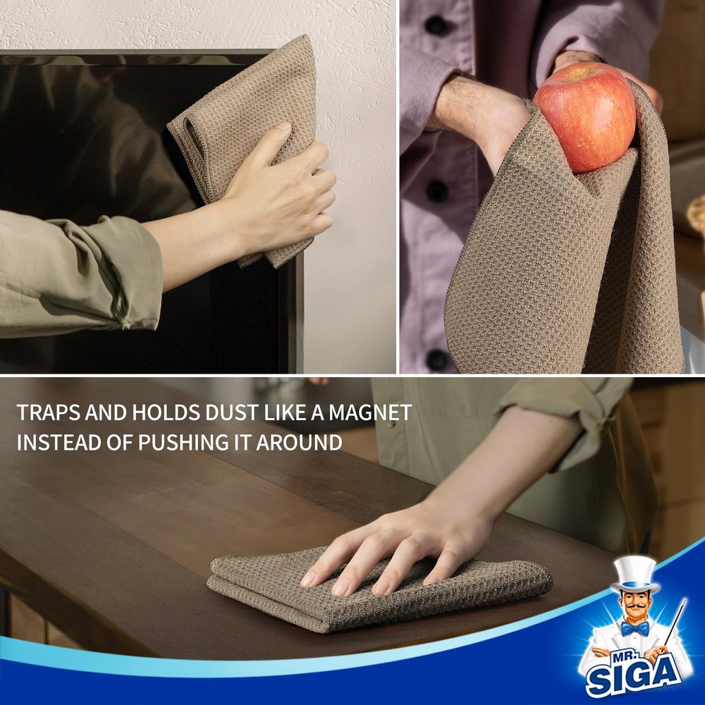 ULTRA SOFT AND SCRATCH FREE MICROFIBER CLEANING CLOTHS: Crafted from high quality microfiber, these kitchen cleaning cloths with soft and gentle waffle weave pattern are designed to be lint free and scratch free, you can clean delicate surfaces like lenses, TV screens, tablets, jewelry, porcelain and stainless steel without worrying about causing any damage. SUPER ABSORBENT AND STREAK FREE: You'll be amazed that these microfiber cleaning rags are super absorbent, making them ideal for soaking up spills and messes in a flash, leaving your surfaces completely streak free. These premium microfiber towels are also perfect dish rags which don't smell, removes grease and particles from microwave ovens, plates, pots or pans effortlessly. TACKLE VERSATILE CLEANING JOBS: The waffle pattern texture enhances their cleaning ability by providing extra scrubbing power for capturing dirt, dust, and spills. Not only that, you will be impressed they are also terrific duster that removes fingertips from silverware and glasses effectively. REUSABLE AND LONG LASTING: These waffle weave texture microfiber cleaning rags feature high quality stitching with reinforced edges. They come in a convenient 6 pack, so you'll always have one on hand when you need it. With their reusable and durable design, these cloths are a cost-effective and eco-friendly alternative to disposable cleaning products. ULTRA SOFT AND SCRATCH FREE MICROFIBER CLEANING CLOTHS: Crafted from high quality microfiber, these kitchen cleaning cloths with soft and gentle waffle weave pattern are designed to be lint free and scratch free, you can clean delicate surfaces like lenses, TV screens, tablets, jewelry, porcelain and stainless steel without worrying about causing any damage. SUPER ABSORBENT AND STREAK FREE: You'll be amazed that these microfiber cleaning rags are super absorbent, making them ideal for soaking up spills and messes in a flash, leaving your surfaces completely streak free. These premium microfiber towels are also perfect dish rags which don't smell, removes grease and particles from microwave ovens, plates, pots or pans effortlessly. TACKLE VERSATILE CLEANING JOBS: The waffle pattern texture enhances their cleaning ability by providing extra scrubbing power for capturing dirt, dust, and spills. Not only that, you will be impressed they are also terrific duster that removes fingertips from silverware and glasses effectively. REUSABLE AND LONG LASTING: These waffle weave texture microfiber cleaning rags feature high quality stitching with reinforced edges. They come in a convenient 6 pack, so you'll always have one on hand when you need it. With their reusable and durable design, these cloths are a cost-effective and eco-friendly alternative to disposable cleaning products. 's mission: Make your housework easier, and make the world cleaner.