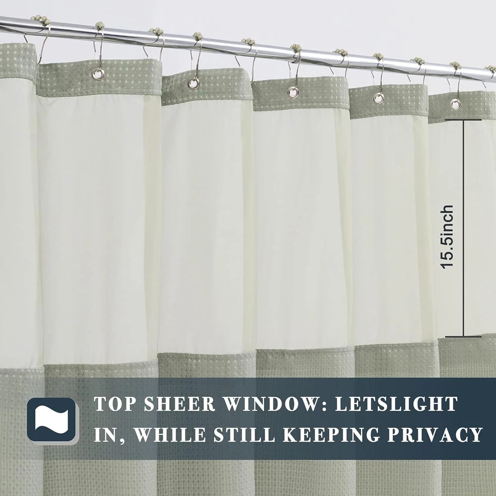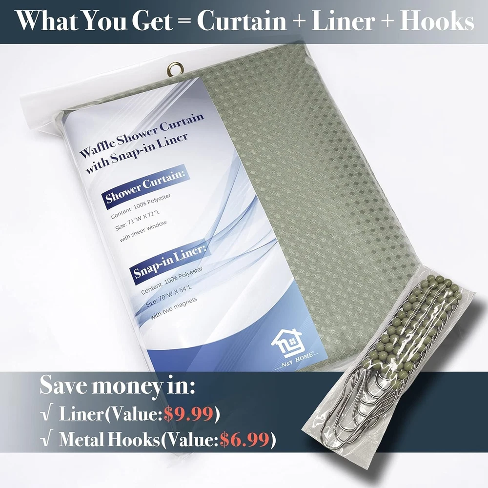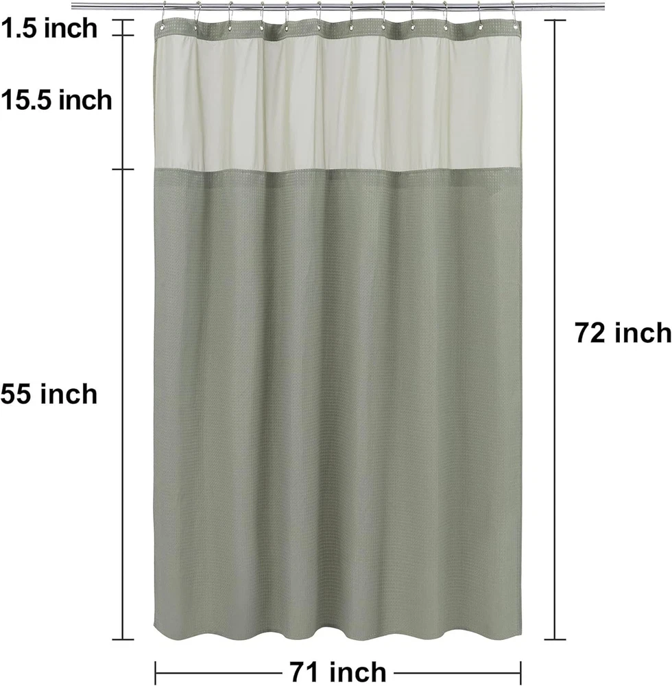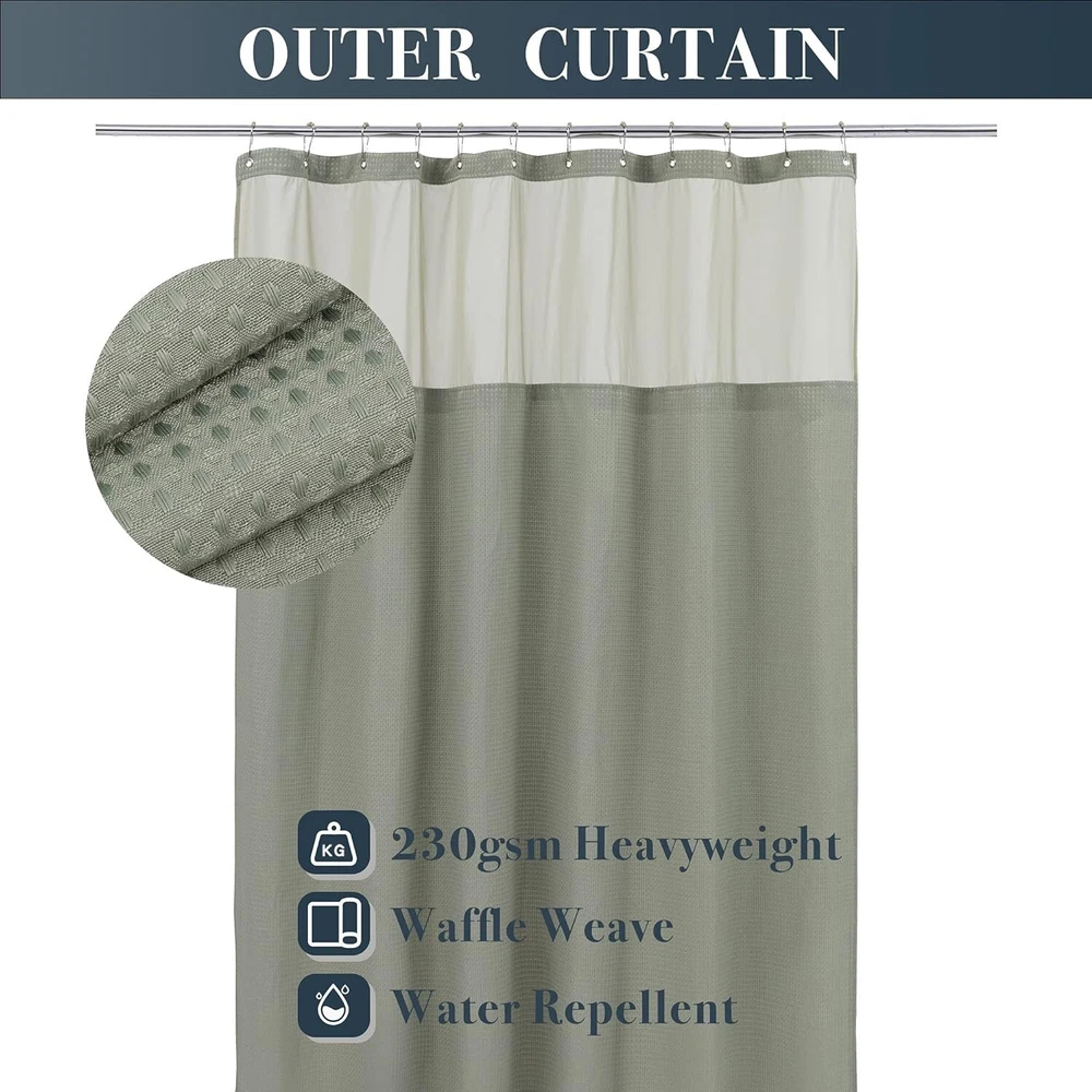 Waffle Weave Shower Curtain with Snap-in Fabric Liner & Hooks Set - Hotel Style, Waterproof & Washable, Heavyweight Fabric & Mesh Top Window - 71x72, Sage Green Outer Curtain: 230gsm Heavyweight "Cotton" Feel Polyester Fabric; Removable Inner Liner: 100gsm Polyester Smart Design Set & Hotel Style: Waffle weave shower curtain with detachable fabric liner set, and free 12 rust resistant metal hooks, the entire 3-in1 set offers a complete solution for bathroom Built-in Liner Inside: The white snap on/off fabric liner is easy for removal, it's convenience for cleaning or . 2 bottom magnets on both corners Sheer Viewing Window: A mesh upper panel lets light in and allows air to circulate, see-through while maintaining privacy, creating a spa shower experience Water Resistant: Both shower curtain and liner set are water repellent to let water glide off and quick to dry, heavy-weight sage outer shower curtain and lightweight white fabric inside attached liner bring a spa experience Easy Care: This sage green shower curtain with snap in liner set can be machine or hand washed to keep it clean, 71" wide by 72" long fits your standard size shower/tub