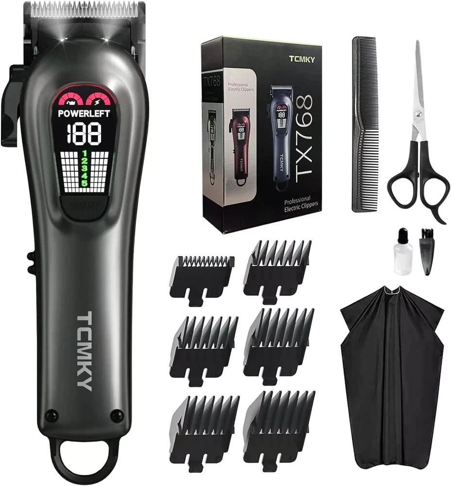 Hair Clippers for Men Professional Hair Trimmer for Men - Cordless&Corded Barber Clippers for Hair Cutting & Grooming, Rechargeable Hair Trimmer Kit for Household(Silvery)… About this item 【CORDLESS&CORDED】TCMKY Hair trimmer can be with cord or cordless which is super convenient for self-cutting. USB charging 3Hours - One full charge Last up to 200 minutes of use.When the power of the hair clipper is used up,This hair trimmer supports plug and play.When charging, The charging capacity can be seen from the display.When the power in the display screen is 100%, unplug the power cord 【High Performance Sharp Steel Blade】: The blade of this hair clippers is sharp, durable and efficient. Precise clearance design improves its safety performance. The depth is close to the skin, and the trimming and friction are small, which will not hurt the skin 【Auxiliary Lighting】 The TCMKY hair clipper is equipped with a suitable lighting option, which is located at the head of the hair clipper. Push the power switch upward to start the hair clipper, and then press and hold the 【SMART]】button for 3 seconds to turn on the lighting function. When traveling, you can efficiently trim even without lighting. 【Professional Hair Clipper&LED Display】- TCMKY Professional Hair Clipper which can display the remaining power,charging reminder indicator and Blade lubrication reminder indicator. Our ultra-high definition LED display provides you with all information to ensure that you use it correctly. In addition, it includes a full-size guide comb to meet your need for trimming your head and face. Due to its low noise and safety blade, it is also suitable for children or young children to have a haircut 【Power Adjustable of 5th Gear 】 When the hair clippers is started for the first time, the default is 1st gear, and the [SMART] button is the gear selection button. Each time this button is pressed, it will increase one gear until the maximum gear 5 is reached. Similarly, this machine has memory function. When the machine is powered off in any gear from 1st gear to 5th gear, the machine will remain in the gear before the power off. It is convenient to remember your most frequently used gear 【Low Noise, Performance Rotary Motor】 The electric clipper's motor is powerful enough to cut through even the thickest hair with ease. The teeth on the blade are tightly line up with each other to remove hair with no snagging or pulling, offering an effective haircut.if you feel any problem. Please contact us,We will provide you a satisfactory solution. 🚚 2 -Day Shipping Receive your order at your doorstep within just 2 day of purchase. We understand the importance of timely delivery and strive to get your products to you as quickly as possible. 🔁 30-Day Free Returns: 24 hour customer support