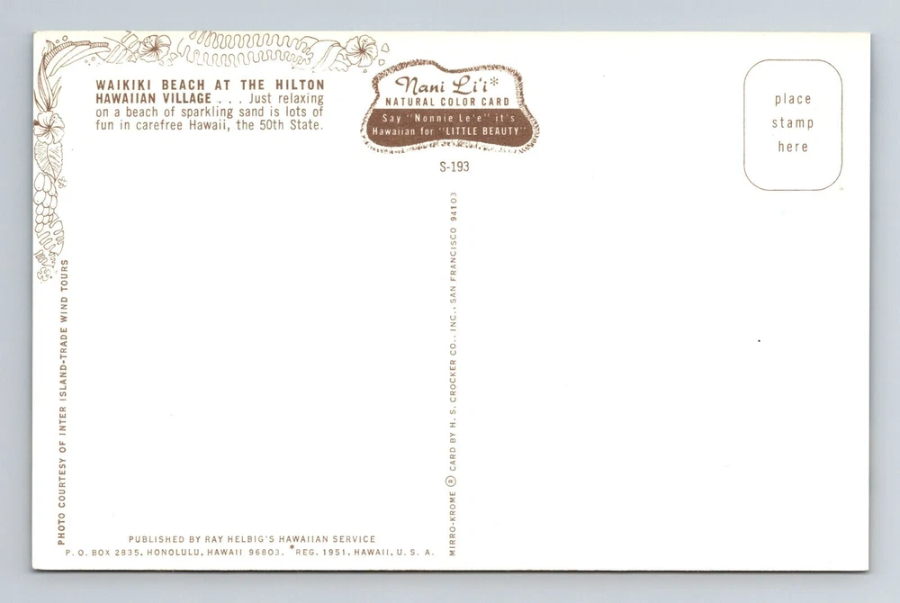 Country/Region of Manufacture: Unknown Unit of Sale: Single Unit Postage Condition: See Image City: Waikiki Original/Licensed Reprint: Original Type: Printed (Lithograph) Era: Chrome Theme: Cities & Towns Subject: Cities & Towns Region: Hawaii Country: USA