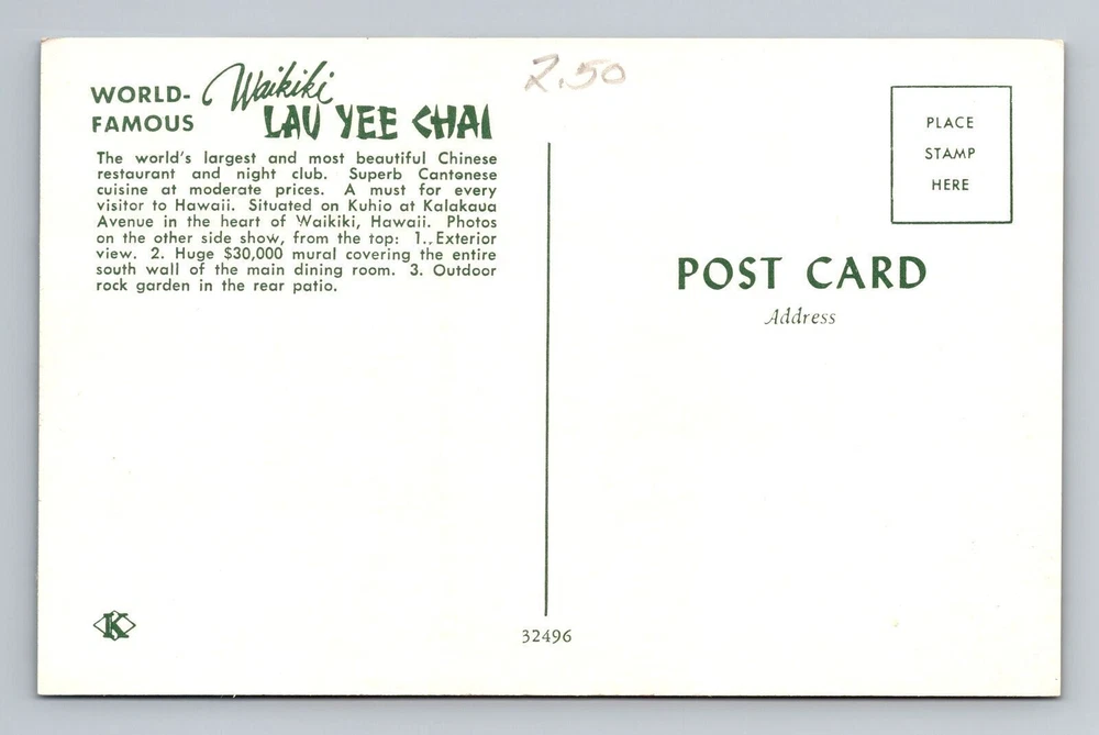 Waikiki HI-Hawaii Waikiki Lau Yee Chai Restaurant, Advertising, Vintage Postcard