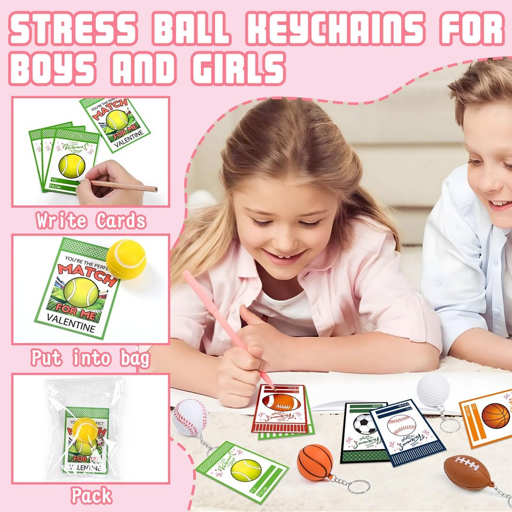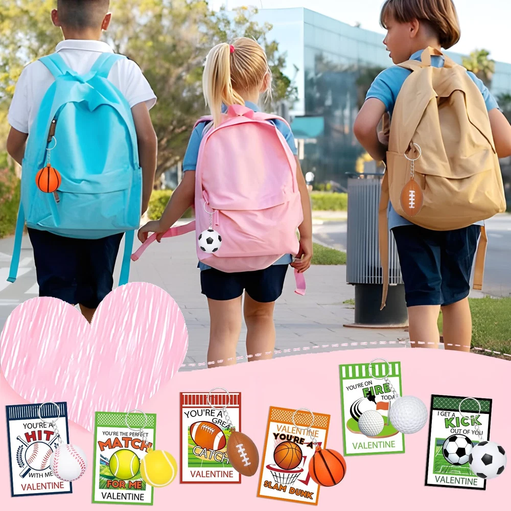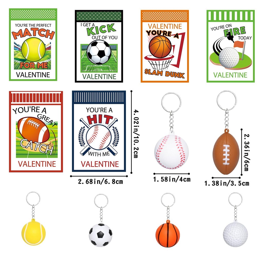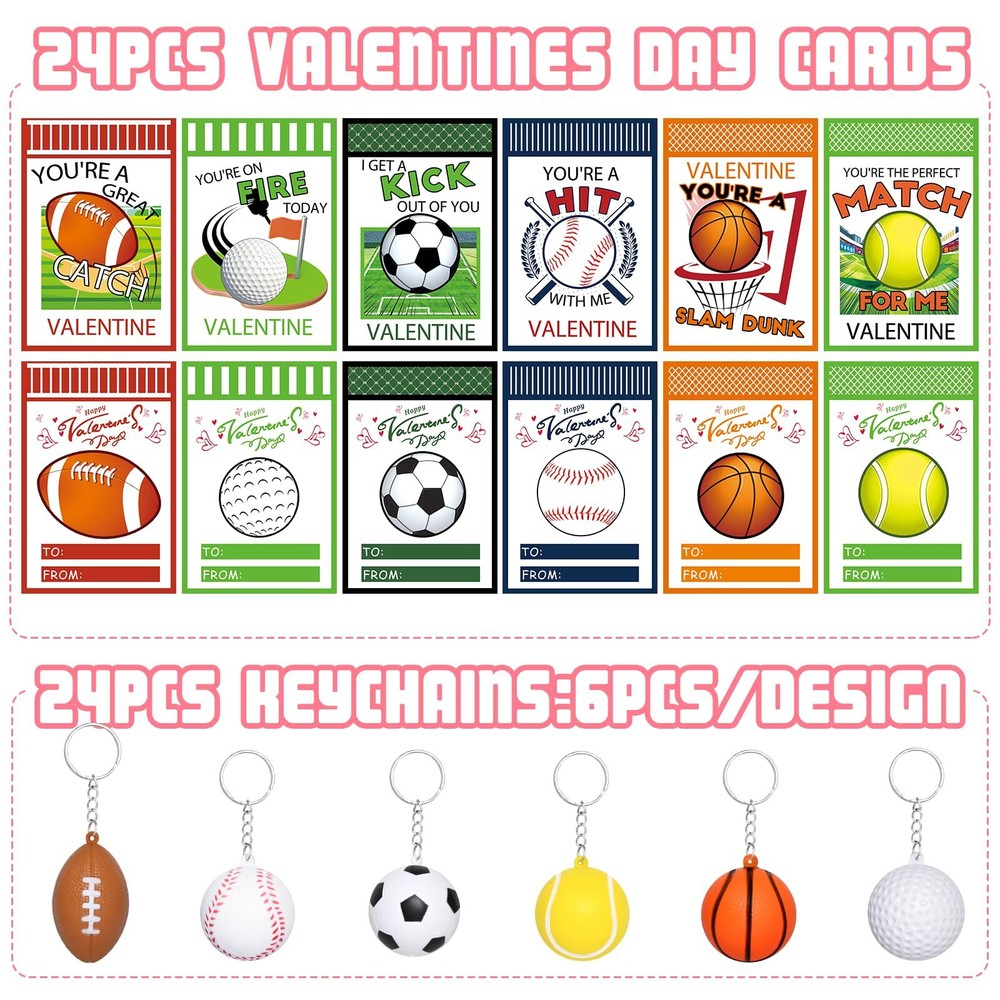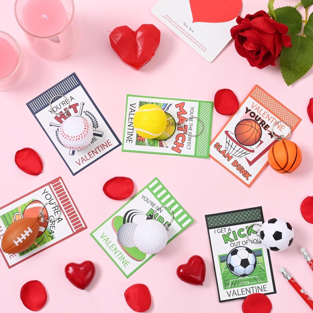 Waipfaru 24Pcs Valentines Day Cards for Kids School, Stress Ball Keychain for Kids Valentines Day Gifts,Valentines Day Cards for Kids Gift Exchange Classroom Prizes Sports Festival Party Favors 🏀VALUE 24PCS VALENTINES DAY CARDS: Comes with 24 Valentine's Day cards + 24 cute stress ball keychains, with each set containing 6 types of cute stress balls, totaling 4 sets. Each card features a special Valentine's Day themed design. Keychain cards and small stress balls is the perfect Valentine's gift for kids. ⚾VALENTINES DAY CARDS FOR KIDS SCHOOL: Unique kids sports Valentine's day cards with clear printing and vibrant colors,specifically designed for kids to exchange gifts. Kids can write the names of friends,family,and classmates on the cards. The bridge of friendship begins here. 🏐These Valentine's Day cards for kids are made from high-quality, sturdy cardstock that securely holds the keychains in place. The stress ball are made from high-quality PU materials that are soft to the touch, resilient, and not easily damaged. These cool sports stress balls have a diameter of 2 inches, making them suitable for boy's small hands to grasp. 🏈CUTE HANGING DECORATION FOR VALENTINES DAY: The sports stress ball key chain has been loved by sports fans and kids, and kids can hang the small stress ball on the bag, hang on the key, hang on any other toys. 🎁VALENTINES DAY GIFTS EXCHANGE: Sports ball keychains are beautifully packaged and loved by children, perfect for Valentine's Day gift exchanges, encouraging kids to share their gifts and show their appreciation to classmates, friends and teachers. A popular choice for gift exchanges, classroom prizes, or any Valentine's Day activity for kids.