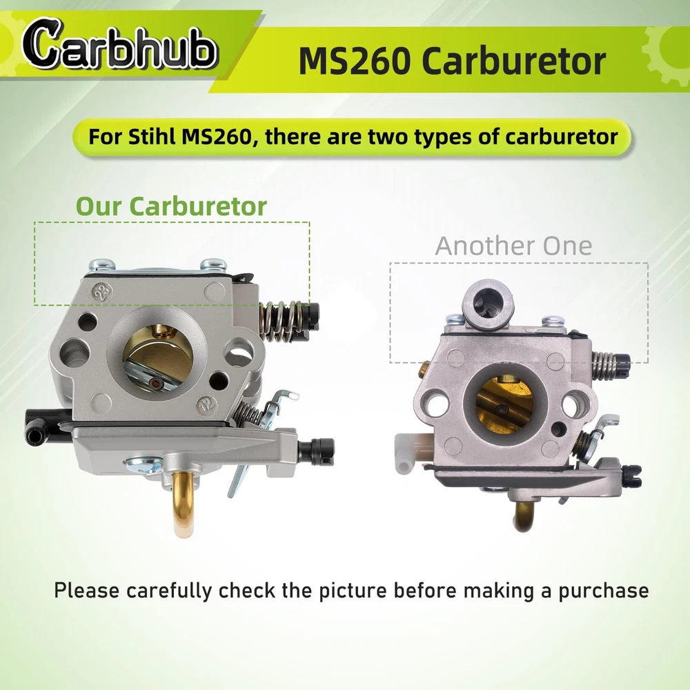 Replace Part Number: Replace # Stihl 11211200611 Fitment: Fit for Stihl 024 026 MS240 MS260 (not fit Stihl 024 or 026 made before 2000) Fit for Walbro WT-194 WT-194-1 Package including: 1 x carburetor 2 x gasket 1 x air filter 1 x fuel filter 3 x fuel line 1 x spark plug Note: 1. The Air filter and Fuel line does not fit Stihl 024 2. For Stihl MS260, there are two types of carburetor. Please carefully check the picture before making a purchase. Carburetor Kit fit for Stihl 024 026 MS240 MS260 (not fit Stihl 024 or 026 made before 2000) Carburetor Kit replace for Walbro WT-194 WT-194-1 Carburetor Kit Replace # Stihl 11211200611 NOTE: The Air Filter and Fuel Line does NOT fit for Stihl 024 Note: For Stihl MS260, there are two types of carburetor. Please carefully check the picture before making a purchase.
