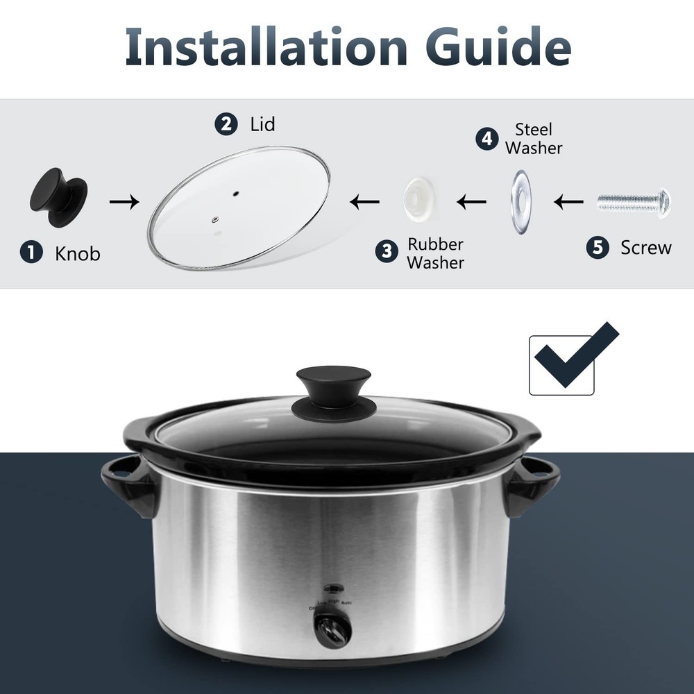 Walfos Universal Silicone Pot Lid Replacement Knob, Heat Resistant Pan Lid Holding Handles, BPA Free,Dishwasher Safe, Great for Slow Cookers, Skillets and Kitchen Cookware Covers, 1 Pack LONG-LASTING POT LID KNOBS REPLACEMENT - Compared to the plastic pot lid knob, WALFOS universal silicone pot lid handle is sturdy and long-lasting, and won't broke or crack. Also the soft and ergonomic design make you comfortable to grip the pan lid knobs. An ideal choice to replace your old or broken ones. HEAT RESISTANT & NON-SLIP - WALFOS BPA free and food grade silicone pot lid handle replacement is heat resistant up to 450°F, making you stay cool to touch and prevent your hand from being injured. Moreover, the NON-SLIP silicone allows you to easily lift your lid. No more worrying about getting scalded or easily slipping the lid off. VERSATILE - Whether it's an oval or round lid, whether it's a tempered glass or stainless steel lid, this pan lid handle will work, suitable for slow cookers, skillets, kettles, saucepans, frying pans, etc., meeting most lids with a mounting hole (Please make sure the hole diameter is larger than the diameter of the silicone washer-7mm). EASY TO INSTALL & CLEAN - Come with 1 x knobs, 1 x screws, 1 x silicone washers and 1 x stainless steel washers, you can install the silicone pan lid handle replacement by your yourself without any trouble. And the non-stick spot lid replacement knobs are super easy to clean, dishwasher safe or you can just rinse with water. SATISFACTION GUARANTEE - We are so confident you'll think we have the best knobs for pots on the market. If you have the slightest problem with our product, please feel free to give us a message and we will send you a new one right away without any cost on your side or full money back. We go out of our way to make sure every customer is happy and satisfied with our product and service.