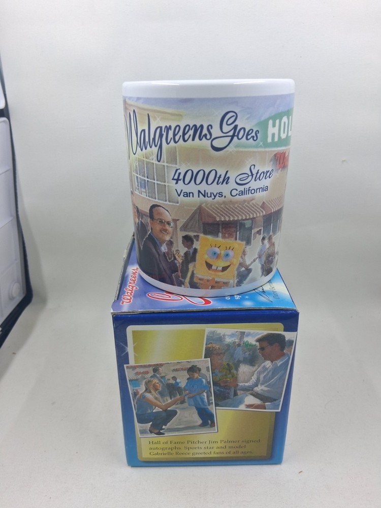 The product is a Walgreens 4000th store coffee mug from Hollywood, Van Nuys, California, created in 2003. The mug features a multi-color design and is a collectible advertising item. Made in China, this mug commemorates a milestone in Walgreens' history and would be a unique addition to any Walgreens merchandise or memorabilia collection.