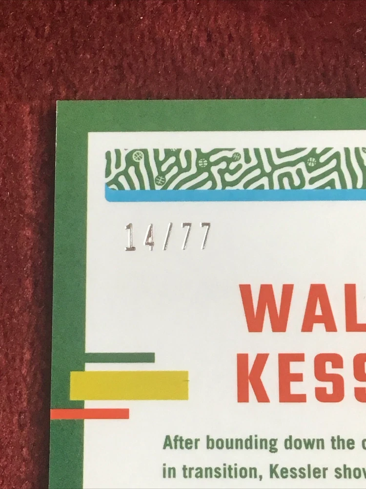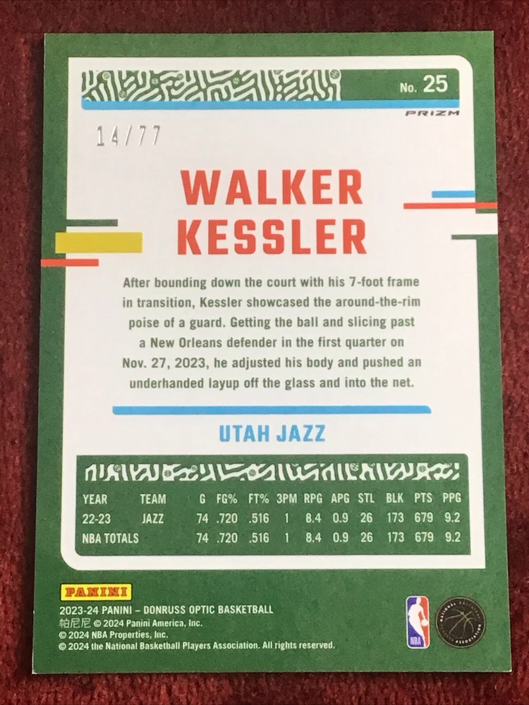 This is a rare and highly sought-after sports trading card featuring Walker Kessler of the Utah Jazz. The card is part of the 2023-24 Panini Donruss Optic Green Glitter Prizm insert set, with a print run of only 77. It is a standard-sized card made of high-quality card stock material. The card is packed with exciting features for collectors, including being serial numbered, a short print, and an exclusive collectors edition. It also comes with a chase element, making it a must-have for any serious basketball card collector. The card is in English language and manufactured in the United States by Donruss.