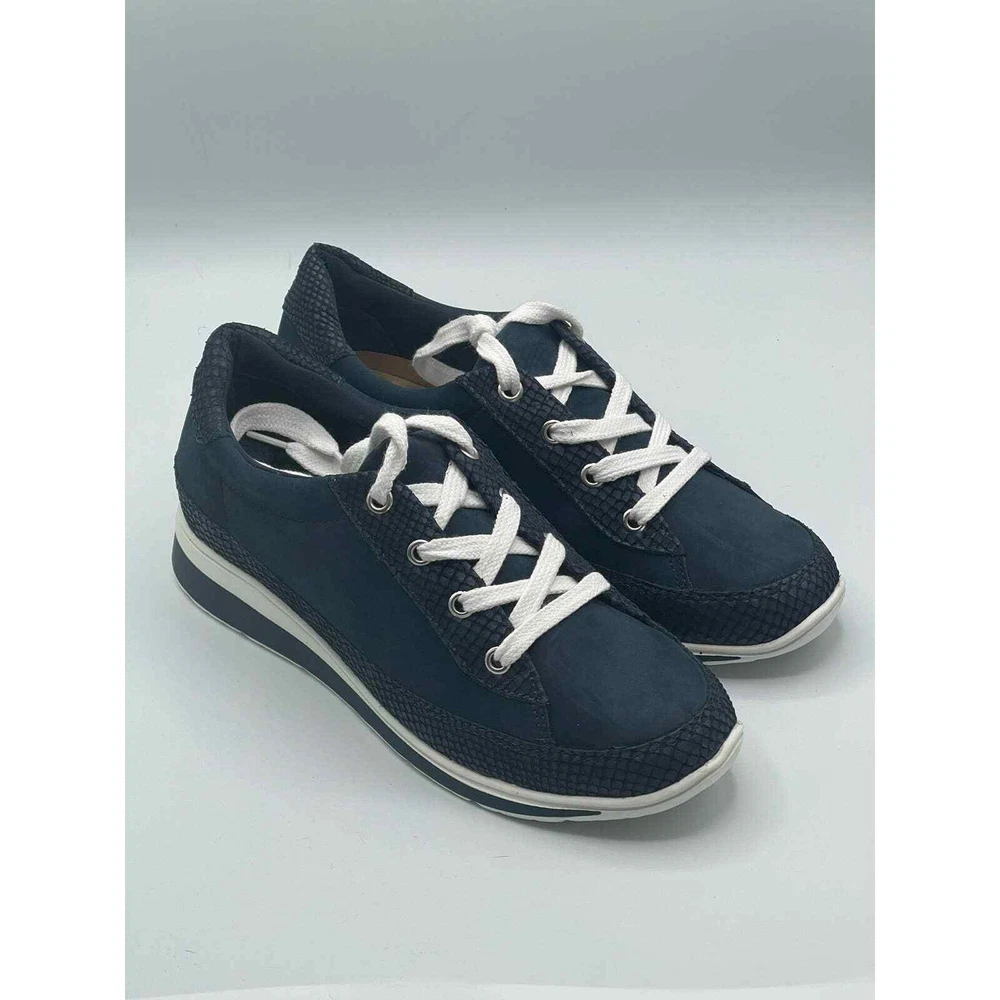 NWT Please see photos for details. White shoe laces have some stains but shoes come with an extra pair of blue laces luxe sneakers crafted with supple leather upper, low wedge heel and a snake print. Features Tiny Pillows construction for massaging effect thanks to non-compacting, open cell foam, which maintains pliability and bounces back after compression Product Details 1.13'' heel Lace-up closure Leather upper Man-made lining Rubber sole Made in Brazil