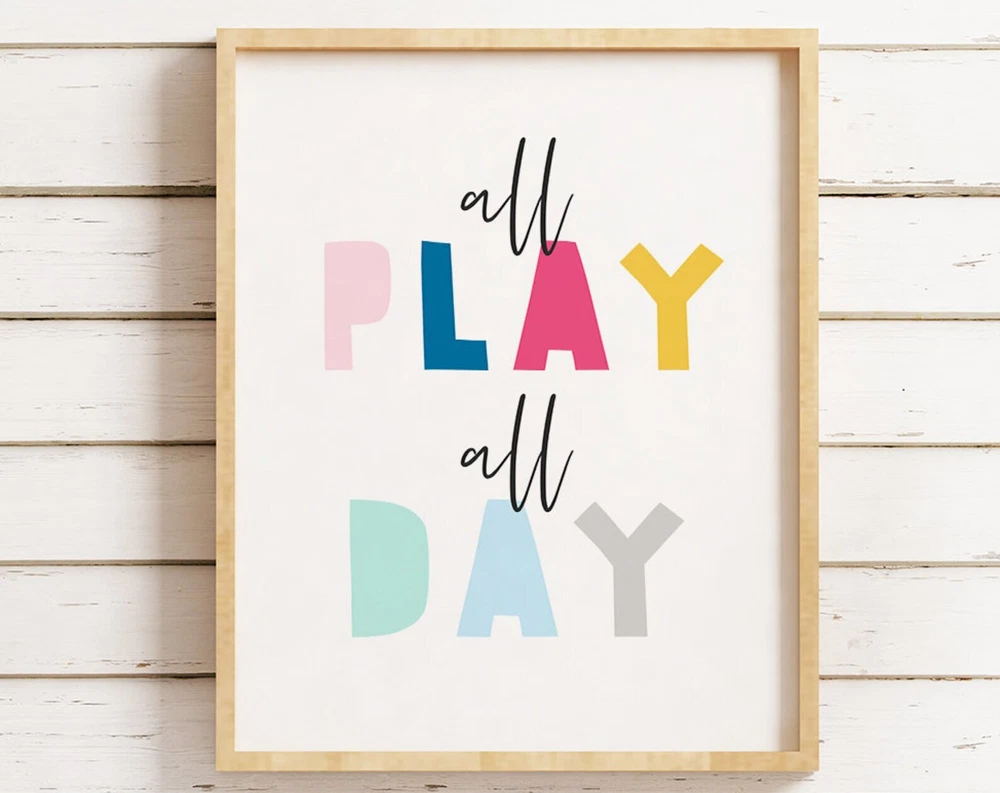 Wall Art For Kids Room Decor All Play All Day Print Nursery Wall Decor Printable Poster Children Playroom Decor Signs Material: Premium luster photo paper Print type: Inkjet printing One side printed + The finish provides the highest possible resolution and color saturation + Lasts up to 200 years in color and 400 years in black-and-white + Printed on high-quality resin-coated photo base paper medium + Posters can be hung with double-sided tape, tacks, or framed + Hand washing with a gentle cry cloth is recommended for extended durability I will hand select the best choice of paper for your chosen design to ensure top quality results for a beautiful, bright and luxurious print. All prints are sealed in cellophane slips for protection during transportation, and are shipped in a protective cardboard envelope.