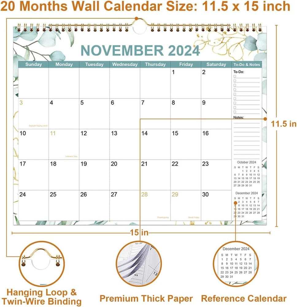 2024-2025 CALENDAR - 20 months wall calendar run from November 2024 - June 2026 the size of this 2024-2025 wall calendar is 12" x 14.5", focus on easy and efficient planning, scheduling and tracking for a manageable life. MONTHLY OVERVIEW - Wall Calendar 2025 monthly page with daily blocks. Wall calendars each block is 1.35”×1.5” and large writing space for daily scheduling. Monthly overview to help you organize your work and life well. STURDY WIRE BINDING - The monthly calendar 2024-2025 with strong twin-wire binding and the hanging loop helps the wall calendar 2024-2025 hangs on the wall easily and sturdy. PREMIUM QUALITY - Using 120 gsm high quallity paper for this 2024-2025 wall planner. The thick, matte paper allows smooth writing and prevents ink bleeding, make it fits most pens. IMPROVE LIFE EFFICIENCY & MANAGEMENT - The calendar planner 2024-2025 can help you become more efficient and you can control your own life with the help of our calendar. Live your own life and become a better version of yourself with this 2024-2025 monthly wall calendar! FIND MORE ABOUT THIS ELEGANT 2024-2025 WALL CALENDAR Features of this calendar 2024-2025: 20 Months Calendar from November 2024 - June 2026. Page size is 12 x 14.5 inch. Strong twin-wire binding and the hanging loop. Writing blocks (1.35" x 1.5") for scheduling. Using 120 gsm high quallity paper prevents ink bleeding. Remind you every important holidays with your life. Beautiful monthly calendar 2024-2025 can help you become more efficient and you can control your own life.
