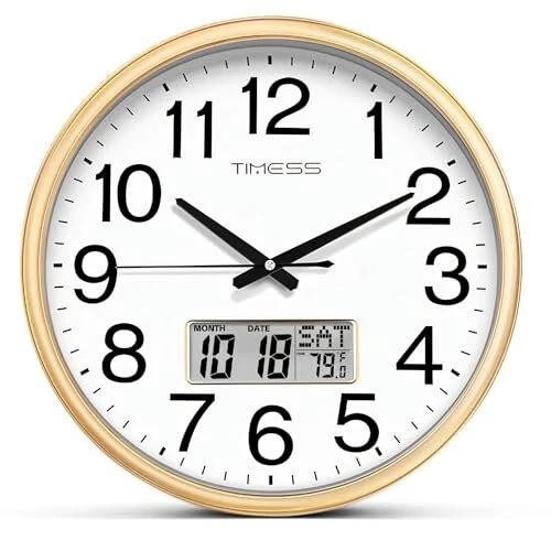 Return Policy Fast Delivery Trusted seller Wall Clock, 11 Inch Non-Ticking Silent Battery Operated Quartz Analog with LCD Display for Perpetual Calendar and F° Temperature, Ideal Modern Home, Bedroom, Kitchen, Office Décor (Gold) Product Description Perpetual Calendar & Temperature Display - Featuring large LCD screen with bold fonts for easy readability from a distance, it accurately displays real-time temperature in Fahrenheit & Month & Date & Weekly Calendar. The screen is independently powered from the clock mechanism, ensuring durability and reliable, long-lasting performance. Battery-Operated Precision Timekeeping - Featuring a high-quality quartz sweep movement, it maintains precise time, year after year. Its reliable mechanism ensures accuracy, making it an essential and trustworthy addition to any space. 2x AA carbon batteries required(not included). Easy to Read & Noise Free - This clock combines classic colors with bold, black numbers on a white background and clear 15-minute marks for visibility and style. Its smooth sweep movement ensures a quiet, tick-free operation, perfect for a peaceful work or relaxation space. Elegant Décor - Showcg a refined wood grain finish frame and a HD glass panel, it combines luxury & durability. The fade-resistant dial promises enduring elegance, rendering it a chic and low-maintenance accent for any room. Modern Design - With its contemporary and sleek design, this clock is ideal for various spaces, including bedrooms, living rooms, kitchens, dining areas, bathrooms, classrooms, and offices. Its universal appeal makes it a fantastic gift for family and friends, adding a touch of elegance and functionality to any room. Shipping Returns Payment Shipping Shipping is FREE to all addresses other than APO/PO boxes in the lower 48 states. All our stock ships from US-based warehouses. Shipped via USPS or UPS (depending on location and package weight) Unless stated otherwise, all orders will ship within 24-72 hours of your payment being processed. Check our feedback to see the great reviews of FAST shipping we offer. Returns Seller does not accept returns Payment We currently accept payment via eBay managed payments only. Once payment is cleared, we will dispatch your shipment within 1-3 business days. Please refer to the "Shipping" tab for more information regarding shipping speed to your destination.