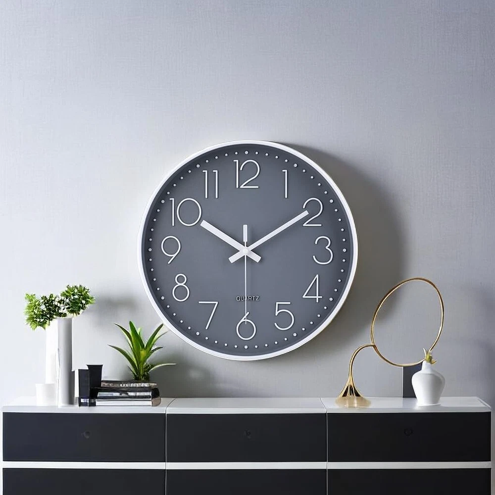 Completely Silent: Precise quartz sweep movement guarantees accurate time and absolutely silent environment,suitable for bedroom, kitchen, meeting room and any other places which needs a silent environment. Modern and Simple Design:stylish modern cement grey dial with large 3D white numbers.This functional art is as beautiful as it is practical! White frame is made of high-quality ABS. The large numbers are clear to read and the front glass cover guarantees crystal - clear view. Contemporary style with gray dial and white numbers also makes it easier to read. wall clock is an accurate timekeeper that’s also a true piece of artwork. This wall clock will complement any contemporary, modern, or traditional home decor.wall clock 12 inch is powerd by one AA battery operated (not included). Brand new battery can last about 1 year. Back slot design offers easy installation,1 hook included. Full Satisfaction Guarantee: If you are unhappy with this clock for any reason, contact us within 90 days for a refund or replacement. There's also a 365 day quality guarantee against defective parts.