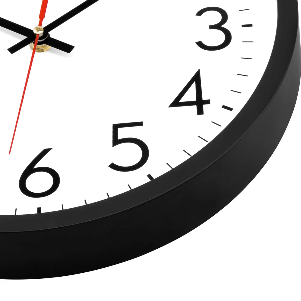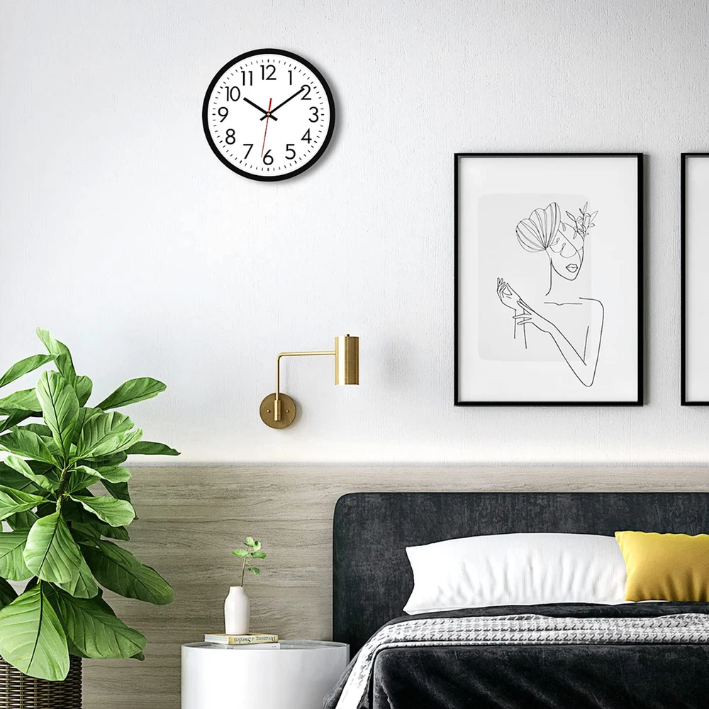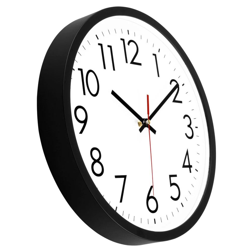 Easy to Read - 12”Large black numerals and red second hand with a non-reflective white clock face that enables you to read it from a distance across the room. The glass lens makes it easy to clean and keeps dust out of the dial Keeps accurate time - The battery operated wall clock tells you the time all day long and is suitable for daily use Silent wall clock - No ticking and buzzing sound, can ensure you work and sleep quietly Simple design - The plastic case of the wall clock is high quality and very sturdy, durable enough for gyms, living rooms, offices, offices, schools Easy to install by oneself - Come with a hook, wide slot in back for easy hanging. Battery powered, requires AA carbon battery (not included). (Alkaline battery or rechargeable battery which may have influence on the life span of clock movement, as well as the accuracy of the time).