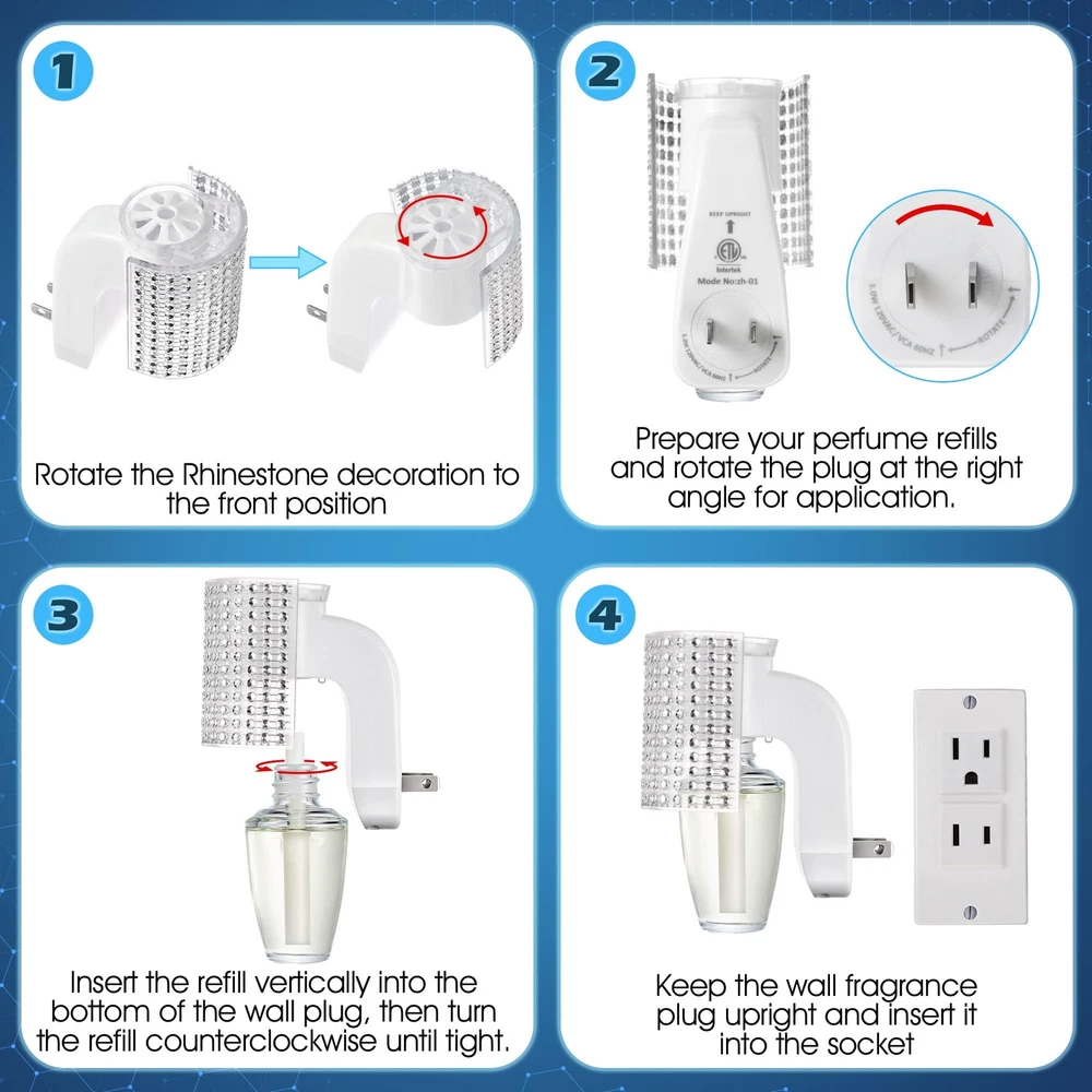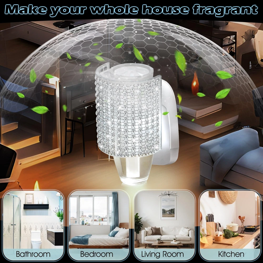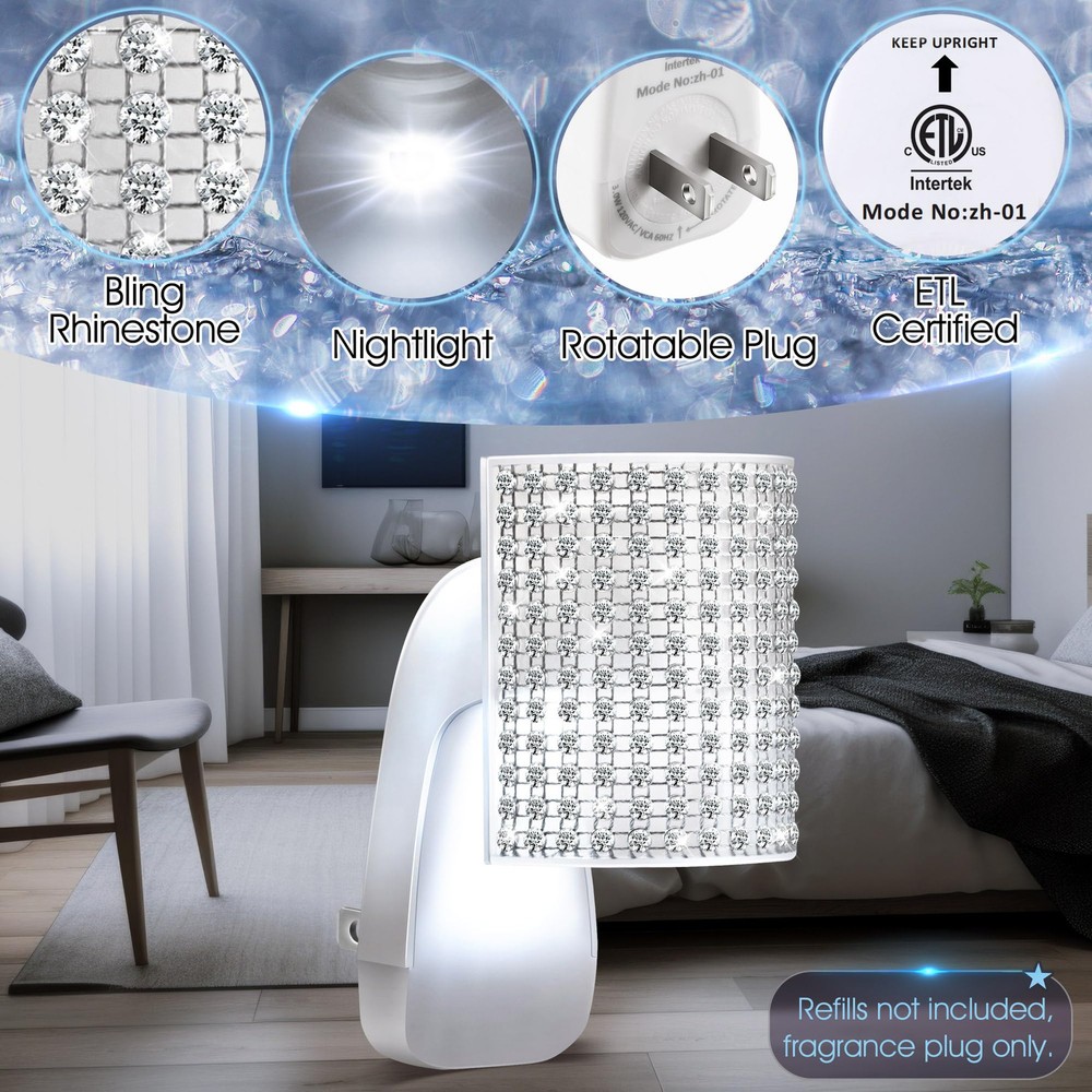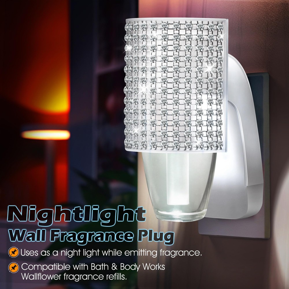 Easy to Plug In: this fragrance plug is with Bath & Body Works WallFlower fragrance refills, ensuring full compatibility so you can get the most out of your product's scent, creating a fresh and inviting atmosphere in your home Wall Fragrance Plug with Nightlight: decorated with beautiful round rhinestones, this plug in diffuser looks especially nice in bathrooms and bedrooms; It can also be applied as a night light, while emitting fragrance, allowing you to fall asleep with the fragrance, creating a pleasant and relaxing atmosphere and improving your sleep quality Always Keep It Upright: designed with a rotatable plug, it can be applied in both vertical and horizontal sockets with a quick twist of the rotating plug to ensure that the fragrance won't spill out Safe to Use: the rhinestone wall fragrance night light plug is ETL certified and meets strict safety standards, making it safer to use and ensuring your peace of mind during use; At the same time, this plug in diffuser operates efficiently at 3 watts, 120V and 60Hz, ensuring long lasting scent enjoyment while reducing energy consumption Wide Range of Uses: this wall fragrance plug works well for bedrooms, kitchens, living rooms, bathrooms, offices or anywhere else you want to be, easily removing odors and purifying the air so you can enjoy a constant fresh scent in your living space