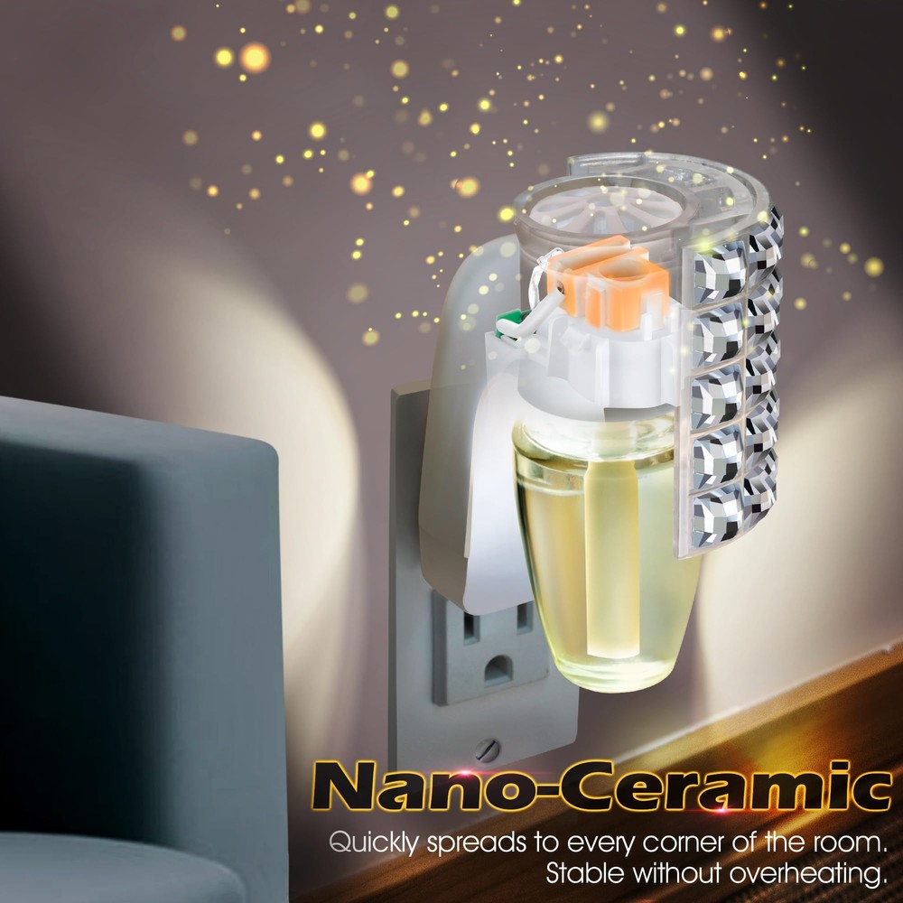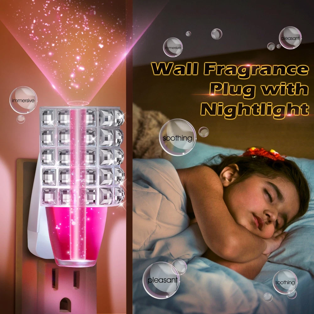 Wall Fragrance Plug In with Rhinestone Night Light (2 Pack) Specifications: Color: white Materials: plastic Shape: square rhinestone Features: This diffuser plug is with Bath & Body Works WallFlower fragrance refills. Not only does it give off an attractive scent, but it can also be applied as a night light. Decorated with square rhinestones, this fragrance plug is very beautiful and delicate. Safe and easy to use, just hold the plug in essential oil diffuser upright, attach the perfume bottle refill to the plug, then plug it in and enjoy the scent. Ideal for use in the home and office. Package includes: 2x Wall Fragrance Plug in Note: Refills not included, fragrance plug only. Easy to Plug In: this fragrance plug is with Bath & Body Works WallFlower fragrance refills, ensuring full compatibility so you can get the most out of your product's scent, creating a fresh and inviting atmosphere in your home Wall Fragrance Plug with Nightlight: decorated with beautiful square rhinestones, this plug in diffuser looks especially nice in bathrooms and bedrooms; It can also be applied as a night light, while emitting fragrance, allowing you to fall asleep with the fragrance, creating a pleasant and relaxing atmosphere and improving your sleep quality Always Keep It Upright: designed with a rotatable plug, it can be applied in both vertical and horizontal sockets with a quick twist of the rotating plug to ensure that the fragrance won't spill out Safe to Use: the rhinestone wall fragrance night light plug is ETL certified and meets strict safety standards, making it safer to use and ensuring your peace of mind during use; At the same time, this plug in diffuser operates efficiently at 3 watts, 120V and 60Hz, ensuring long lasting scent enjoyment while reducing energy consumption Wide Range of Uses: this wall fragrance plug works well for bedrooms, kitchens, living rooms, bathrooms, offices or anywhere else you want to be, easily removing odors and purifying the air so you can enjoy a constant fresh scent in your living space