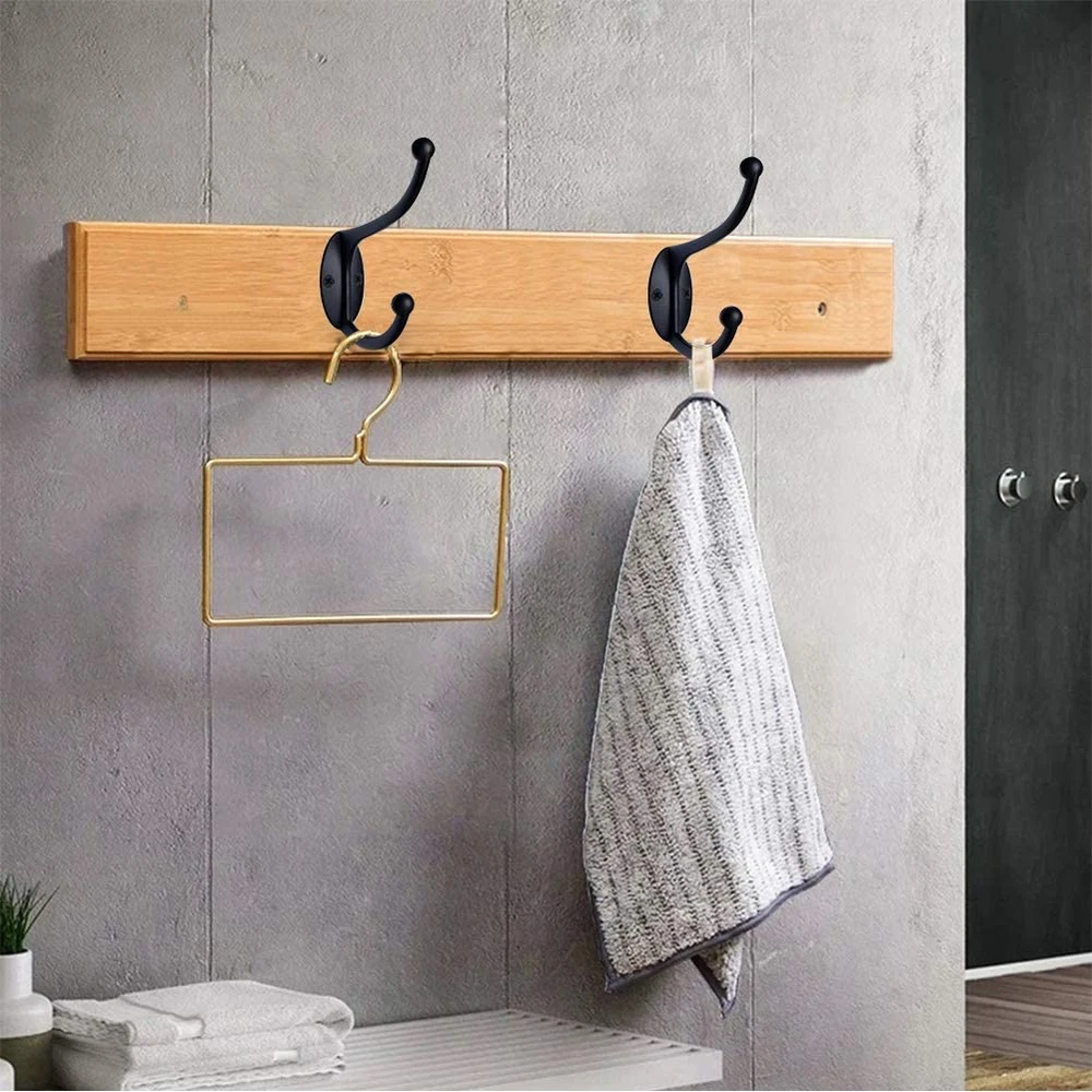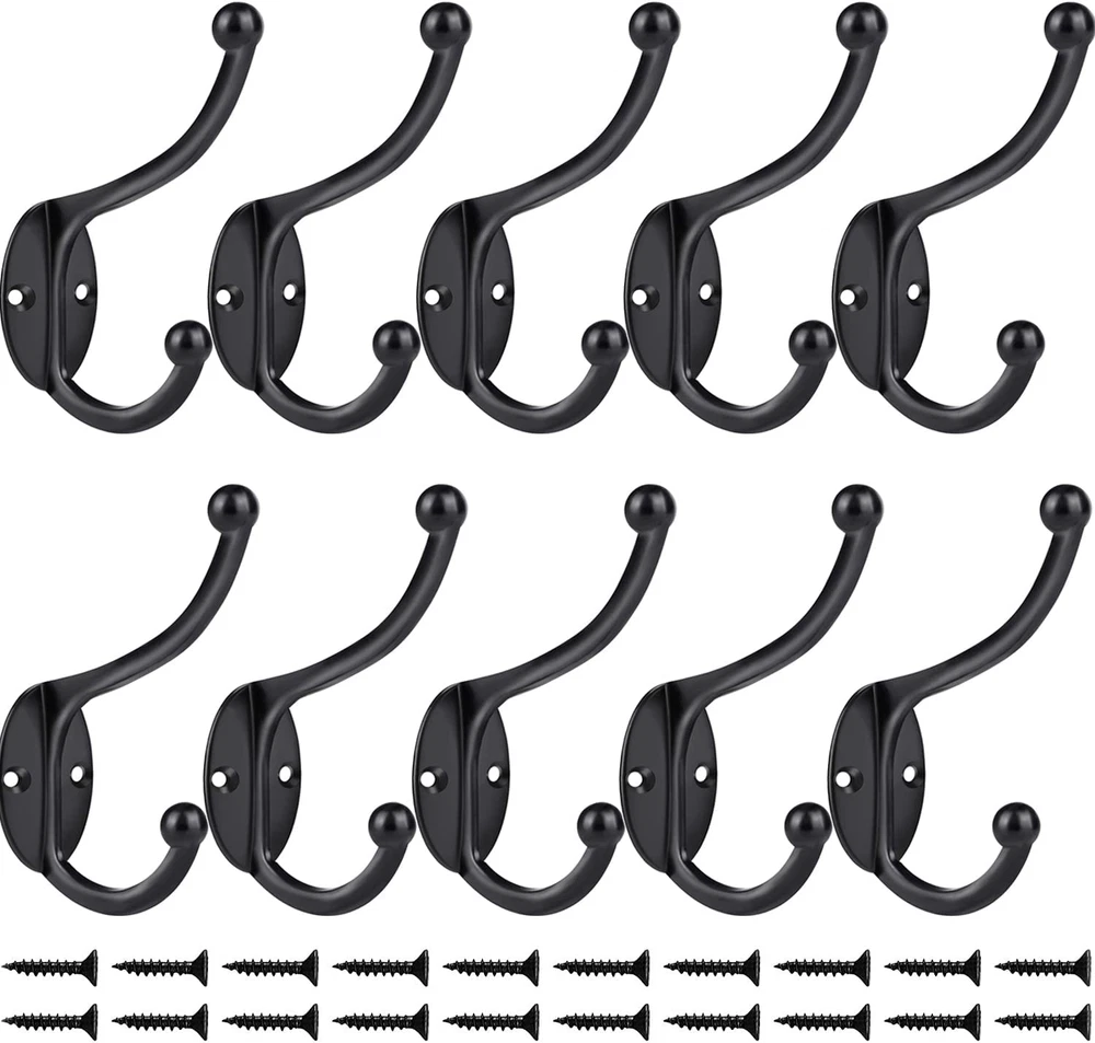 High Quality Material - These black coat hooks are made of good quality zinc die-cast material, hard and durable, it can easily hold up to 35 lbs of weight. Dual Hooks Design - This classic double hook design, can widely support coat, scarf, umbrella, bag, towel, key, hat, cup. It's a good way to store your space. Size: the clothes hook dimension is 91 x 65 mm/3.6 x 2.6 inches, screws are 19 mm long and 3 mm in screw head diameter. Easy to Install - The coat hooks are easily mounted into solid wood or wood studs, you can use the screws to mount hooks directly to closets or doors. Package Includes: 10pcs coat hooks , 20pcs screws 10 Pack Black Coat Hooks Hardware Heavy Duty Hooks for Hanging Coats Double No Rust Hooks Wall Mounted with 20 Screws for Key, Towel, Bags, Scarf, Cup, Hat High Quality Material - These black coat hooks are made of good quality zinc die-cast material, the screws are made of iron, it can easily hold up to 35 lbs of weight. Hard and durable. Dual Hooks Design - This classic wall mounted double hook design, can widely support coat, scarf, umbrella, bag, towel, key, hat, cup as well as Christmas socks and Christmas wreath. These double hooks is a good way to store your space Size: the clothes hook dimension is 91 x 65 mm/3.6 x 2.6 inches, screws are 19 mm long and 3 mm in screw head diameter, easy for installation Easy to Install - The coat hooks are easily mounted into solid wood or wood studs, you can use the screws to mount hooks directly to closets or doors. Package Includes: This package includes 10 pieces of double prong hooks with 20 pieces of screws