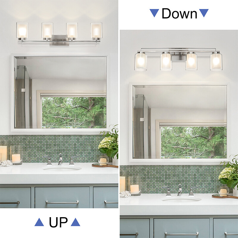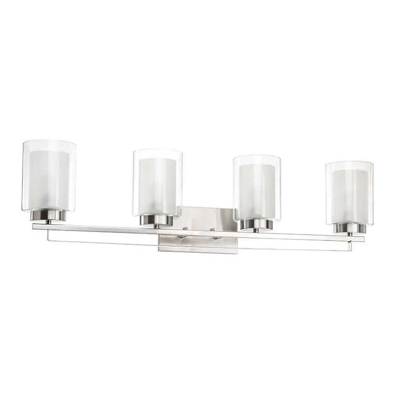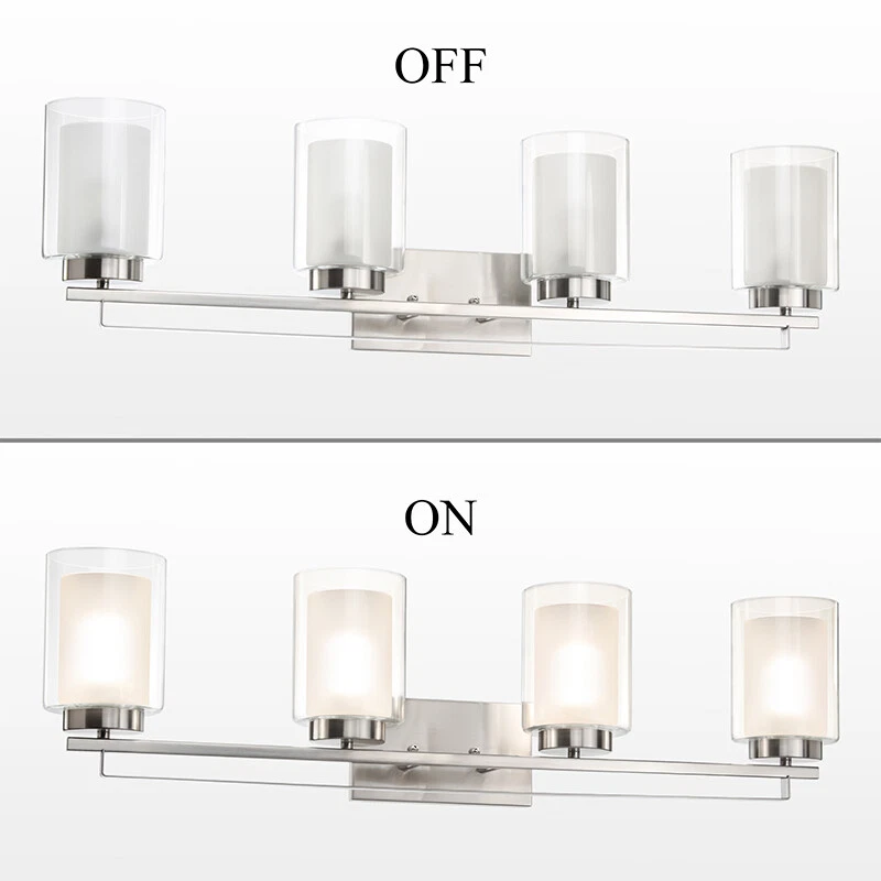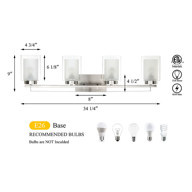 This 4 Light Wall light fixtures is hardwired product, that features dual shade (outer clear glass and inner frosted glass), minimal detailing, and in brushed nickel finish. Sconce light fixtures are easy to install and can be mounted as either uplight or downlight. Its transitional design will be added a rich ambiance to your rooms, which is suitable for bathrooms, bedrooms, corridors, entryways, kitchen, restaurant, dining, and living areas Bathroom lighting with sturdy metal construction in brushed nickel finish. Indoor wall light with sturdy clear glass shade & frosted glass shade allows emit ample glow to light up the whole space. Product Specification Dimension: W: 34-1/4" x H: 9" x D: 6-1/4" Finish: Brushed Nickel Shade Material: Dual Glass Shade Dimensions: W: 4-3/4" x H: 6-1/8" Socket: E26 Socket 4x60W (Bulb not Included) Compatible with Variety of Bulbs This wall light is suggest to use “A” Type Max. 4x60W bulbs for medium base (E26 socket) (incandescent bulb or equivalent CFL / LED bulbs) The fixture is dimmable when using the dimmable bulb with compatible dimmer switch. Bulb not Included Family Products XB-W1195-1-BN Dimension W: 4-3/4" x H: 9" x D: 6" Finish Brushed Nickel Shade Material Dual Glass Clear Glass Shade Diamension W: 4-3/4" x H: 6-1/8" Frosted Glass Shade Diamension W: 3-1/2" x H: 5-1/8" Socket E26 Wattage 1x60W (Bulb not Included) XB-C1294-5-BN Dimension W: 25-3/4" x H: 55" Finish Brushed Nickel Shade Material Dual Glass Clear Glass Shade Diamension W: 4-3/4" x H: 6-1/8" Frosted Glass Shade Diamension W: 3-1/2" x H: 5-1/8" Socket E26 Wattage 5x60W (Bulb not Included) XB-P1195-BN Dimension W:4-7/8"x H: 58-3/8"Max Height Finish Brushed Nickel Shade Material Dual Glass Clear Glass Shade Diamension W: 4-3/4" x H: 6-1/8" Frosted Glass Shade Diamension W: 3-1/2" x H: 5-1/8" Socket E26 Wattage 1x60W (Bulb not Included) XB-W1195-3-BN Dimension W: 24-3/8" x H: 9" x D: 6-1/4" Finish Brushed Nickel Shade Material Dual Glass Clear Glass Shade Diamension W: 4-3/4" x H: 6-1/8" Frosted Glass Shade Diamension W: 3-1/2" x H: 5-1/8" Socket E26 Wattage 3x60W (Bulb not Included) Terms of Sale Shipping Policy: We ship within 1-2 business day from receipt of payment. We do not change your shipping address by email. Please make sure your address is correct before checking out and making payment. Payment Policy We accept most major credit cards, including, but not limited to, Visa, Mastercard, American Express, or Discover card and PayPal. All major credit cards are accepted through secure payment processor eBay Payment. All payment must be made within 7 days of the end of the auction. Otherwise, an "Unpaid Item Dispute" will be filed with eBay. Return Policy If you have any questions about purchases or concerns on our products or accessories replacement, please feel free to contact us through eBay's Message Center. However, if a return is required, please kindly noted that all returns should be met with following conditions: All return requests must be within 30 days of receipt. Return item must be in original condition as received (brand new in sealed package / with tags). Refund of purchase price less original shipping will be issued. Return postage is buyer's responsibility. Original shipping is not refundable for products features free shipping unless we're found at fault. We won't be able to refund if products are found damaged or used. Thank you. Any accessories (such as: Glass) broken via transportation can be replaced for free within 30 days receipt. However, If exceed the valid date to contact us that need you to pay for the accessories (such as: Glass), thanks!