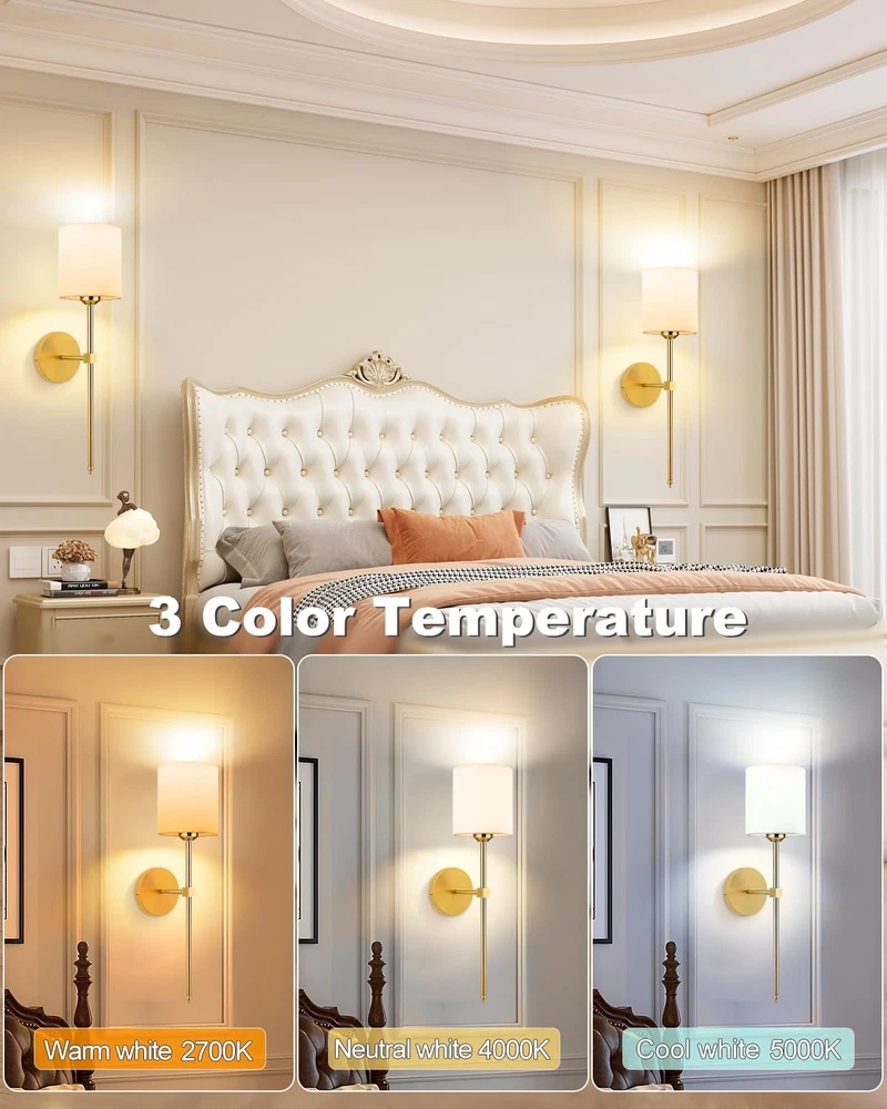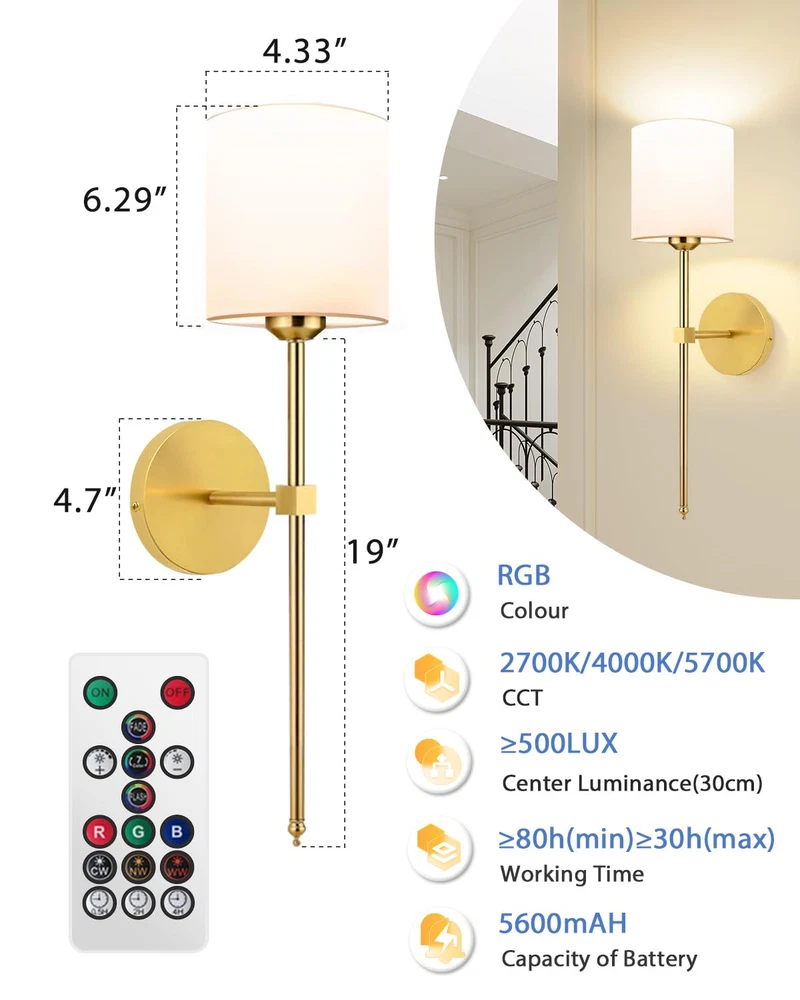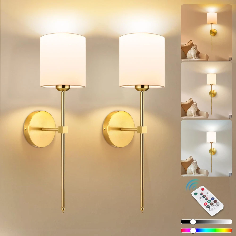 🏠Exquisite Design & 5600 mAh Bulbs : wall sconces set of two comes with two firm long post stand arms, white fabric shades and two 5600 mAh rechargeable wall battery operated lights bulbs. It also can work 30H for the highest brightness and 80H for the lowest brightness. It will enhance your bedroom, living room, dining room or hallway decor! 💡Dimmable & High Brightness: The rechargeable wall sconce provide three color temperatures—2700K warm, 4000K natural, and 5700K cool white. It can adjust the brightness from 25% to 100% and use the remote to experience 10 RGB light colors, which unique and exquisite design will give you a comfortable and relaxing atmosphere. 🏠Smart Remote & Wireless: Wall sconces set of two comes with the smart remote control, it can control separately or simultaneouly, it's up to you. Whether sleeping in bed, staying in living room, walking in the hallways or busy in the kitchen, just press or touch on the remote, all can adjust the light colors you want and make your home full of warmth. 🏠Wall lamp Versatile Style : Wireless scones set of 2 is a good decoration to use for bedroom wall light for reading, bedside lamps, living room wall light and dining room wall scones, also can use for closet, bathroom vanity, dressing table and kitchen, or even dark areas like hallways and corridors wall sconce. 💌After-sell Service: Wireless sconces set of 2 included ( 2 * lampshades, 2 * remote control ,2 * Typ-C Cables, 2 * bulbs and 1 * manual ). If you have any questions please contact us through Amazon, will solve all your problems within 12hrs. Click 𝗕𝗨𝗬𝗡𝗢𝗪 and you can buy the wall sconces set of two you want today to make your home bright and cozy.